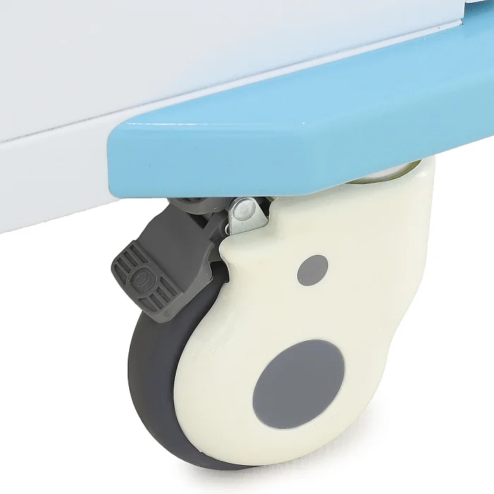 Два передних колеса оснащены индивидуальными тормозами с блокировкой поворота, поэтому столик-тележка уверенно фиксируется на месте во время процедур. Слева расположена транспортировочная ручка, которая упрощает перемещение по отделению и делает управление более удобным даже при полной загрузке.