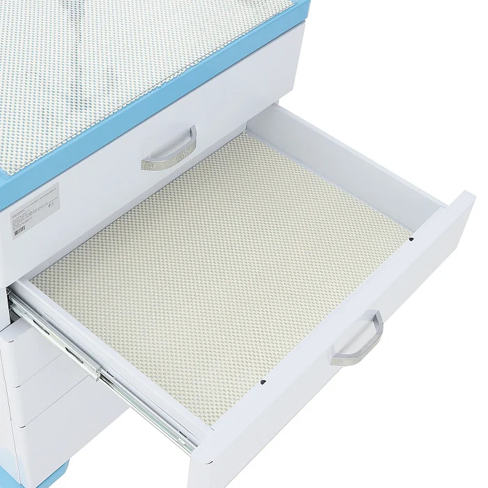 Главная особенность модели ЕТ006 TM-010AH-00 — грамотная компоновка, рассчитанная на реальную клиническую практику. Пять выдвижных ящиков позволяют раздельно разместить медикаменты, перевязочные материалы, шприцы, катетеры, инструменты и сопутствующие принадлежности. Верхний ящик оснащён замком, что удобно для хранения препаратов и материалов, требующих ограниченного доступа. Внутри предусмотрен съёмный лоток с перегородками, который можно адаптировать под мелкие предметы и сформировать до 48 ячеек.