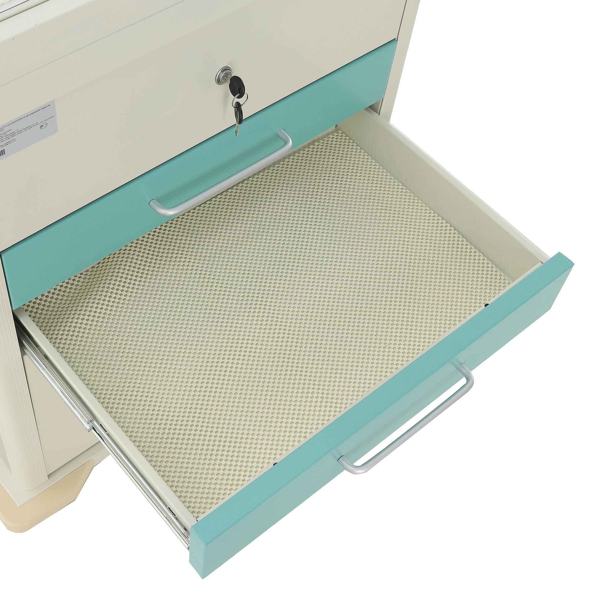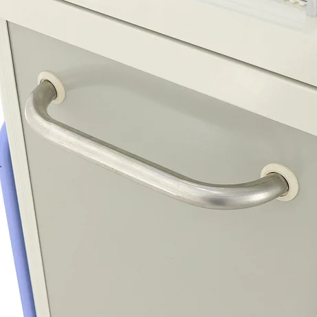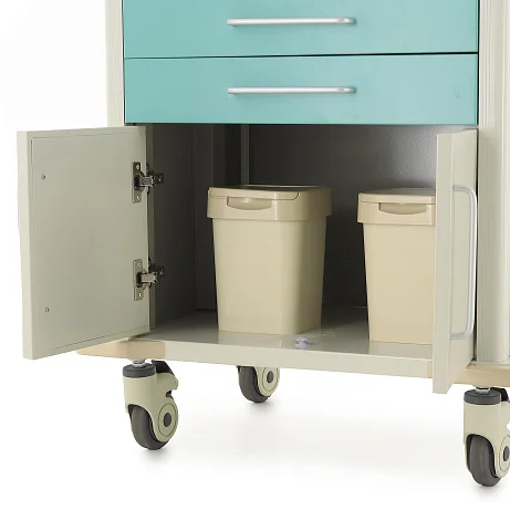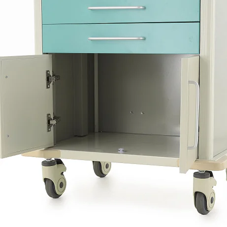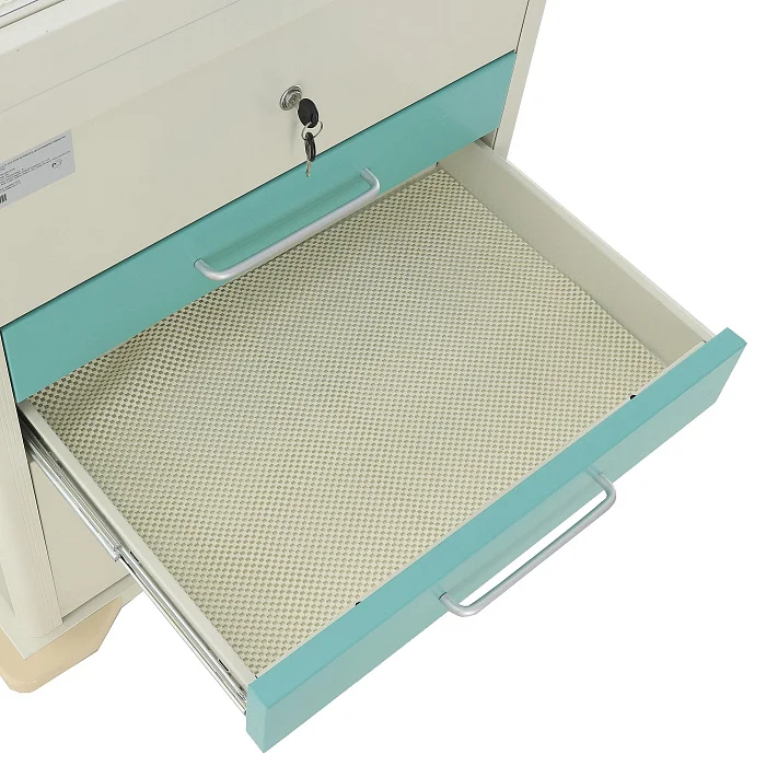 Столик-тележка ЕТ016 ТМ-009АН-00 создана так, чтобы персоналу было проще поддерживать порядок и быстро ориентироваться в содержимом. Два выдвижных ящика оснащены пластиковыми лотками с возможностью организации до 48 ячеек, что удобно для сортировки ампул, шприцев, катетеров, перевязочных средств и других необходимых принадлежностей. Один замок закрывает оба ящика, что делает хранение более безопасным и организованным.