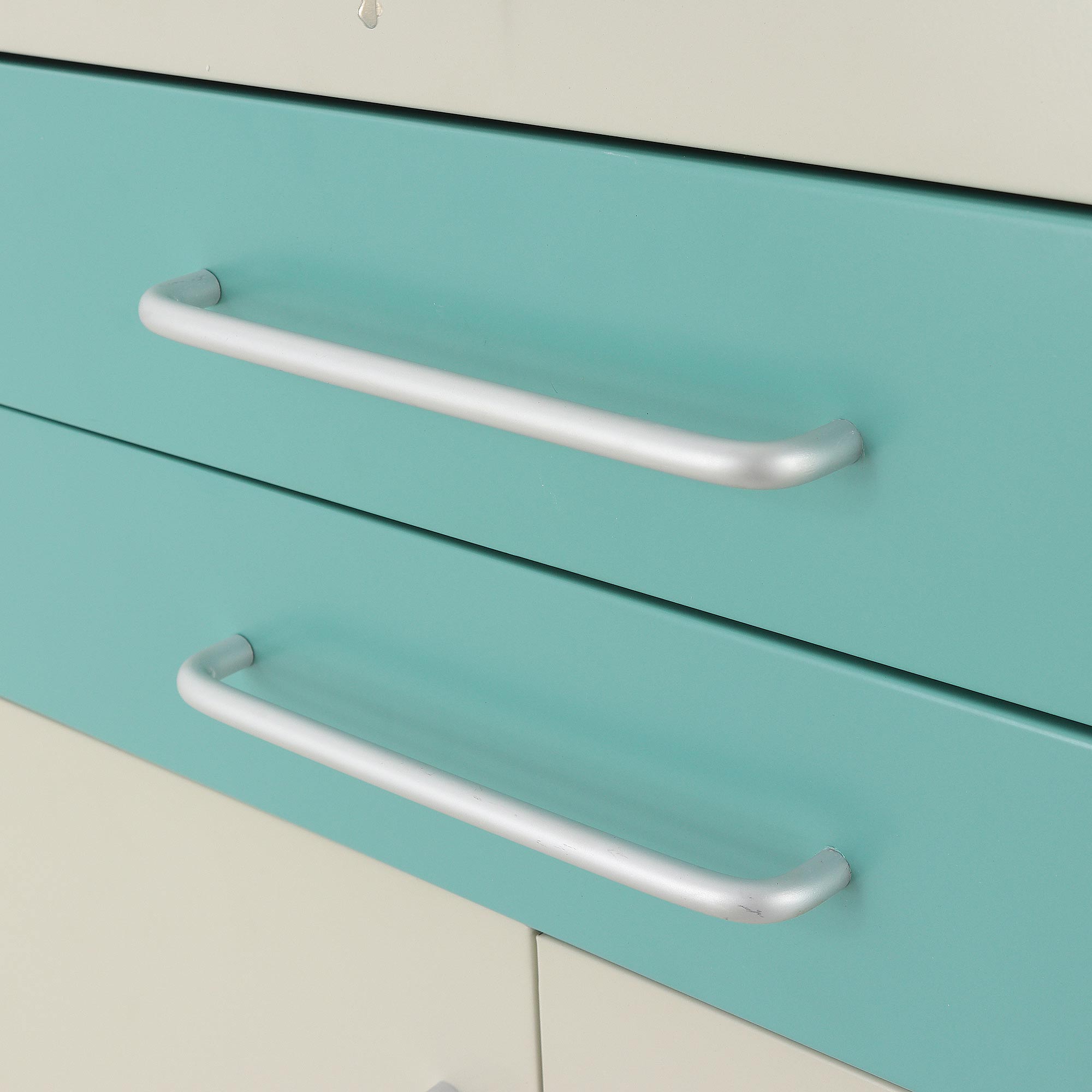 Каркас модели выполнен с использованием четырех алюминиевых стоек и стальных стенок с ударопрочным эмалевым покрытием. Основание и столешница изготовлены из гнутого стального листа, что придает изделию необходимую жесткость и устойчивость при ежедневной эксплуатации. Такое исполнение хорошо подходит для медицинских учреждений, где мебель и оборудование используются постоянно, с высокой нагрузкой и частыми перемещениями.