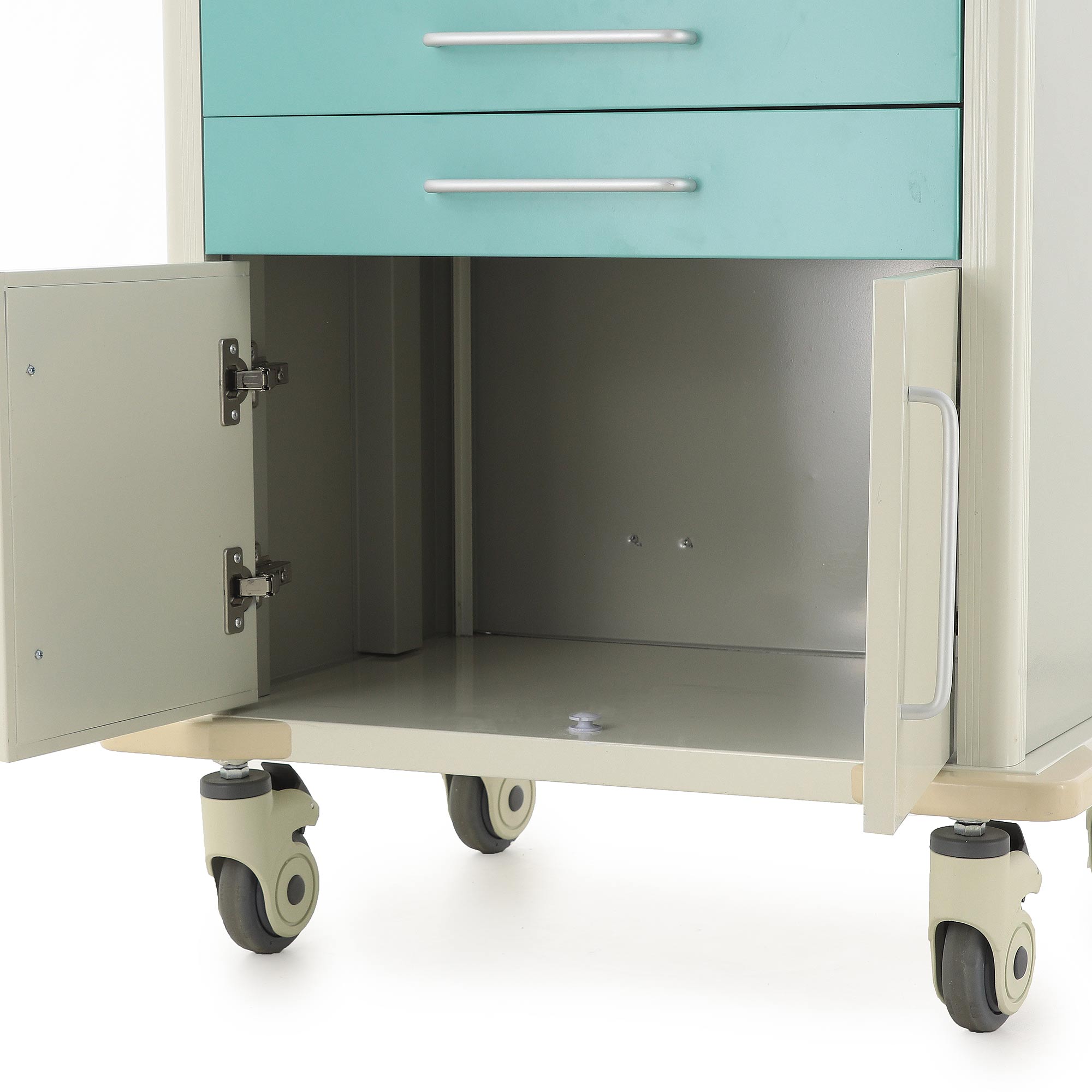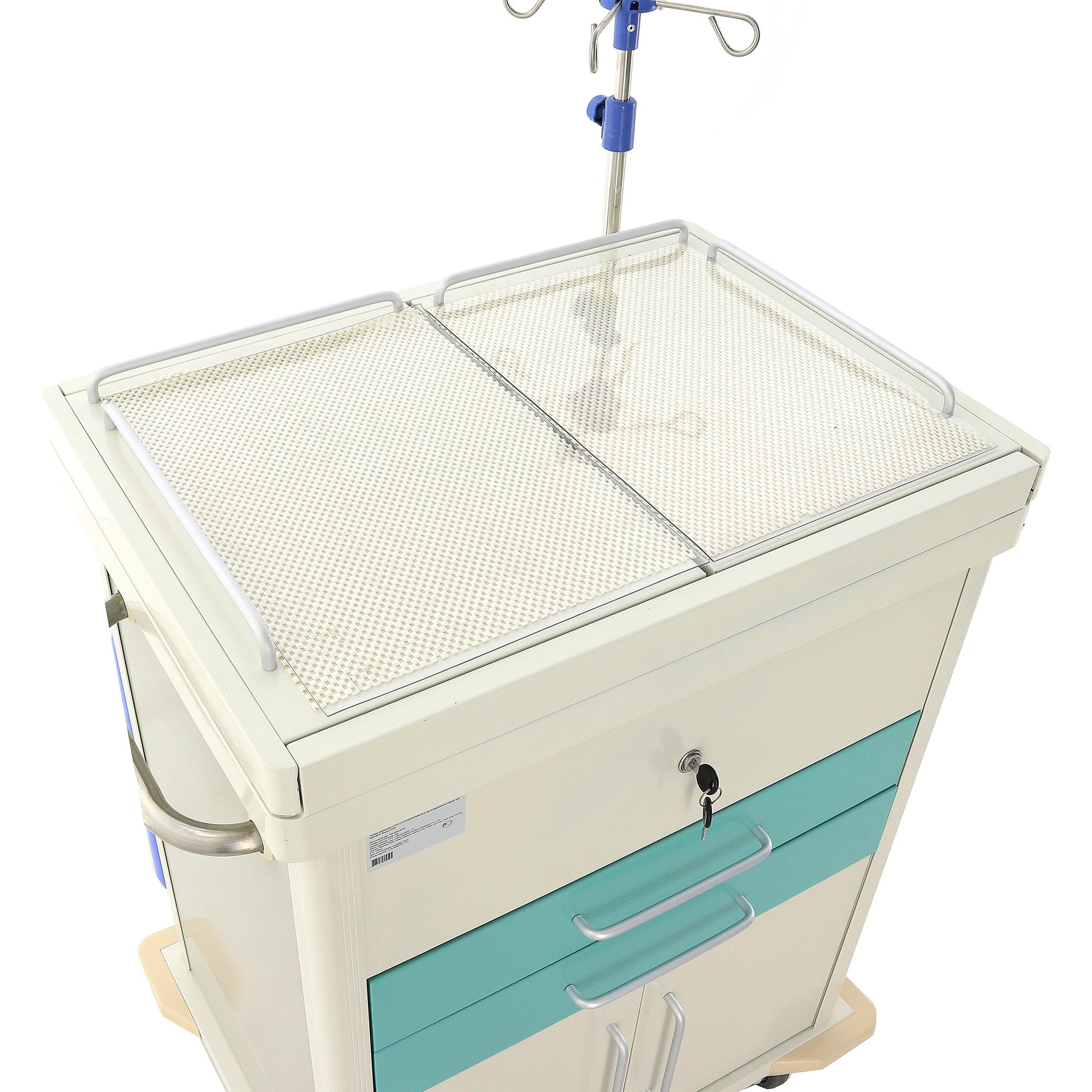 Главная особенность модели — раздвижная столешница из двух половин, которая не только формирует удобную рабочую поверхность, но и скрывает вместительное внутреннее отделение с пластиковым лотком и замком. Такое решение особенно удобно в ситуациях, когда важно быстро получить доступ к препаратам, перевязочным материалам или инструментам и одновременно защитить содержимое от случайного смещения и несанкционированного доступа.