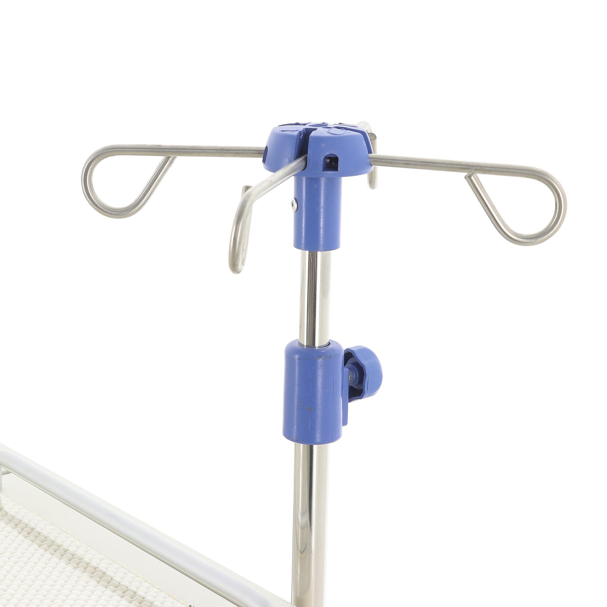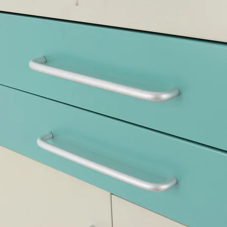 Для удобства перемещения предусмотрена транспортировочная ручка из нержавеющей стали. Справа на задней стенке установлена инфузионная стойка с четырьмя крючками и бесступенчатой регулировкой высоты от 1310 до 2050 мм. Это расширяет возможности использования модели и позволяет применять ее не только как мобильную систему хранения, но и как полноценный рабочий модуль рядом с пациентом.