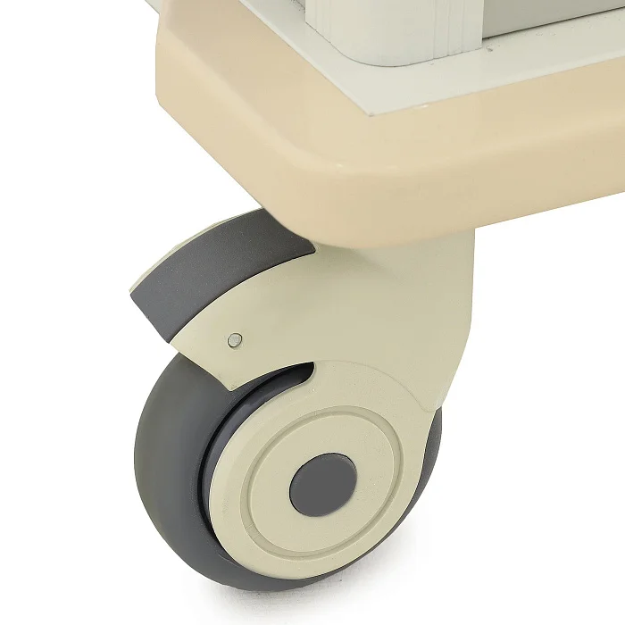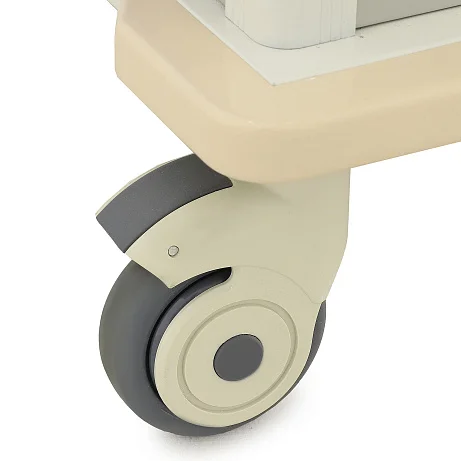Столик-тележка установлена на четыре самоориентирующихся колеса с поворотом на 360°, что позволяет легко менять направление движения даже в тесных помещениях. Полиуретановые шины обеспечивают плавный ход и уменьшают шум при перемещении. На двух передних колесах предусмотрены индивидуальные тормоза с блокировкой поворота, благодаря чему изделие можно надежно зафиксировать в нужной точке.
