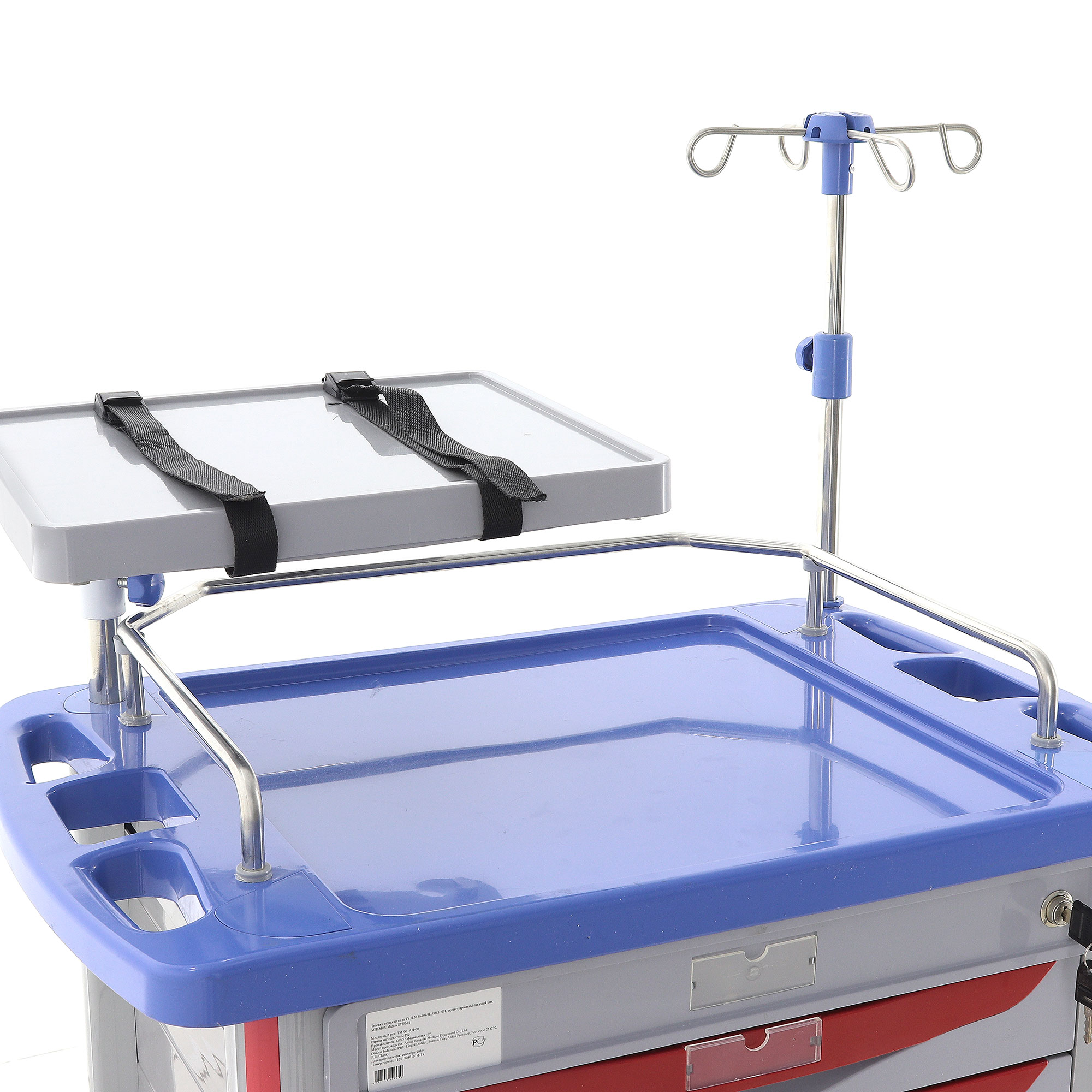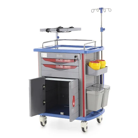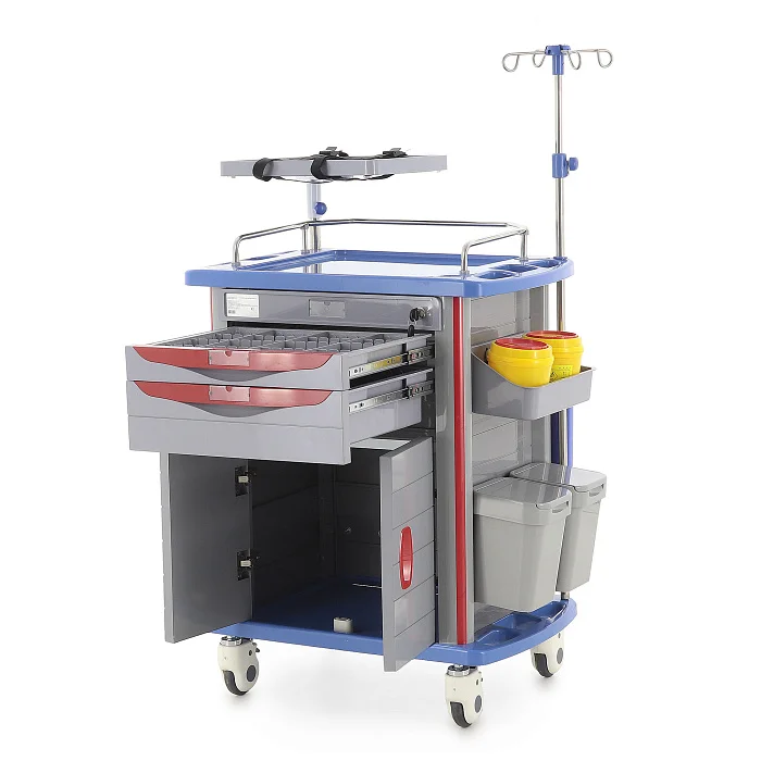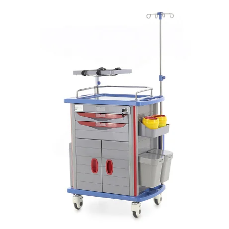 Одним из важных преимуществ модели является богатая комплектация. Столик-тележка уже подготовлен к работе и позволяет разместить большое количество вспомогательных элементов без необходимости подбирать их отдельно. Инфузионная стойка из нержавеющей стали и синего пластика устанавливается справа сзади, имеет четыре крючка и регулируется по высоте от 120 до 205 см, что удобно для проведения инфузионной терапии в различных сценариях использования.