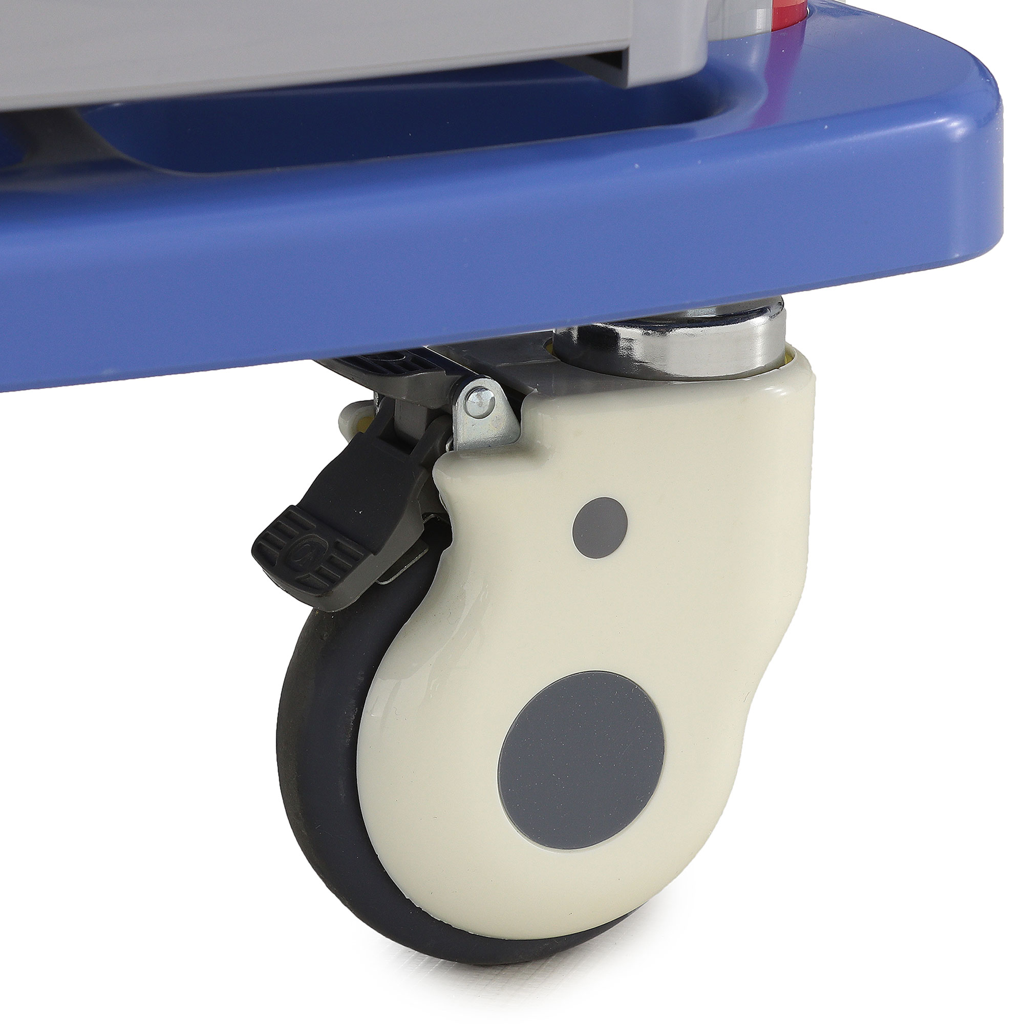 Столик-тележка оснащен четырьмя одинарными колесами из немаркого полиуретана. Они амортизируют при движении, легко поворачиваются на 360° и не оставляют заметных следов на напольном покрытии. На двух передних колесах предусмотрены индивидуальные тормоза с одновременной блокировкой поворота, что позволяет надежно фиксировать изделие в нужной точке.