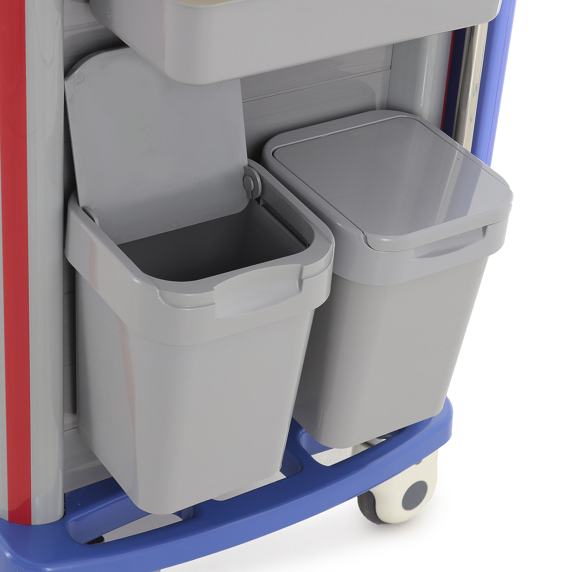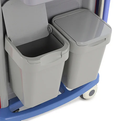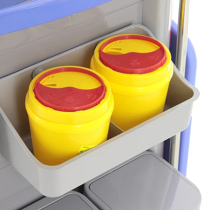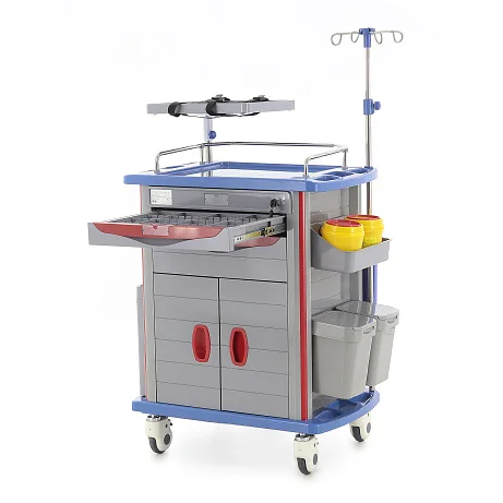 В конструкции предусмотрены два выдвижных ящика из серого пластика с красными ручками и прозрачными карманами для маркировки. Такое исполнение особенно удобно в условиях интенсивной работы: персонал может быстро ориентироваться в наполнении и поддерживать понятную систему хранения. В каждом ящике установлено по шесть съемных перегородок, что позволяет гибко адаптировать внутреннее пространство под ампулы, перевязочные материалы, инструменты, катетеры, шприцы и прочие медицинские принадлежности.