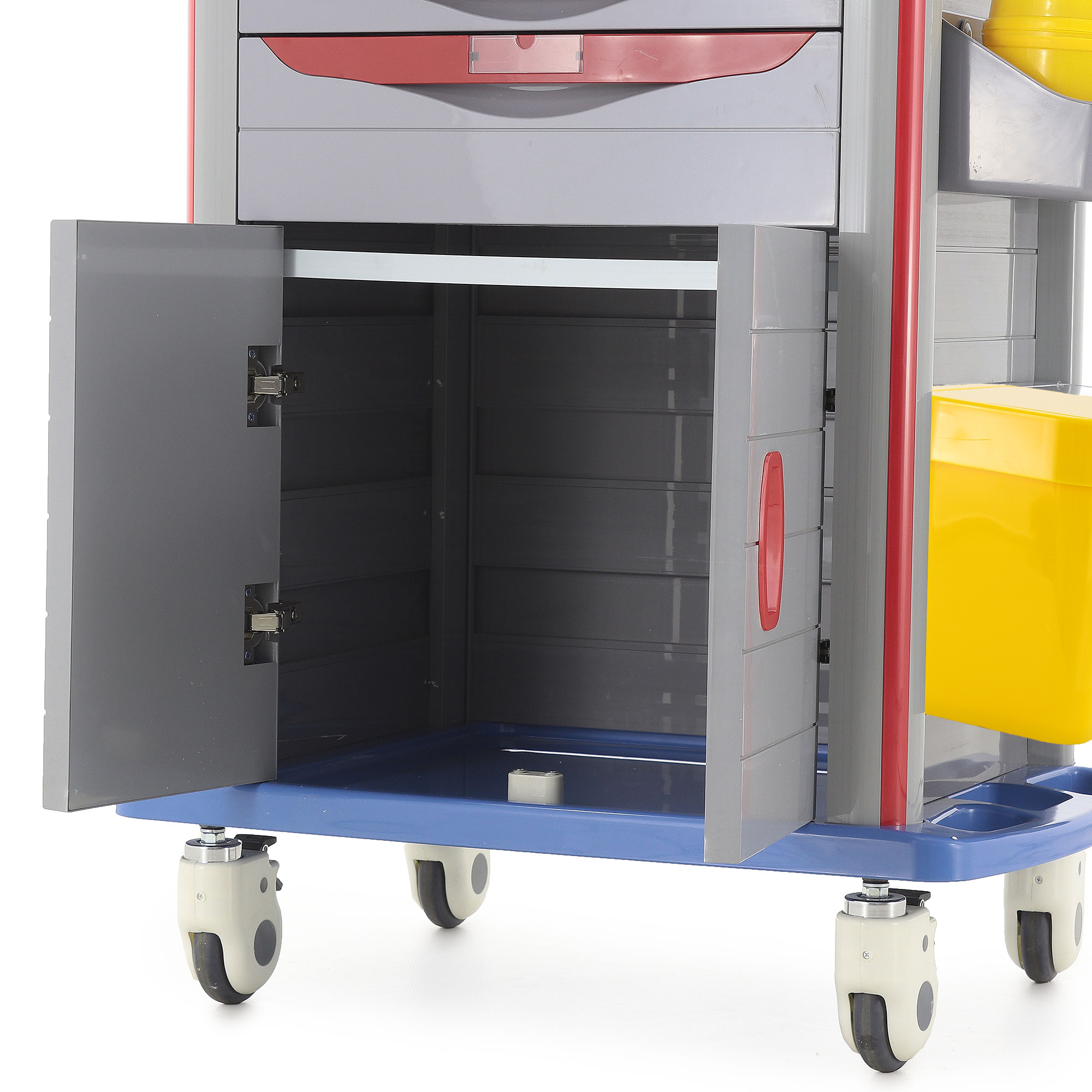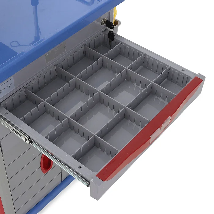 Одно из главных достоинств модели — грамотная организация внутреннего пространства. Столик-тележка оснащен двумя выдвижными ящиками разной высоты, что позволяет разделять медикаменты, перевязочные материалы, инструменты и расходники по категориям. В комплект входят 12 перегородок, с помощью которых удобно настраивать внутренний объем под конкретные задачи отделения. Оба ящика запираются одним замком, что повышает безопасность хранения содержимого и помогает поддерживать порядок на рабочем месте.