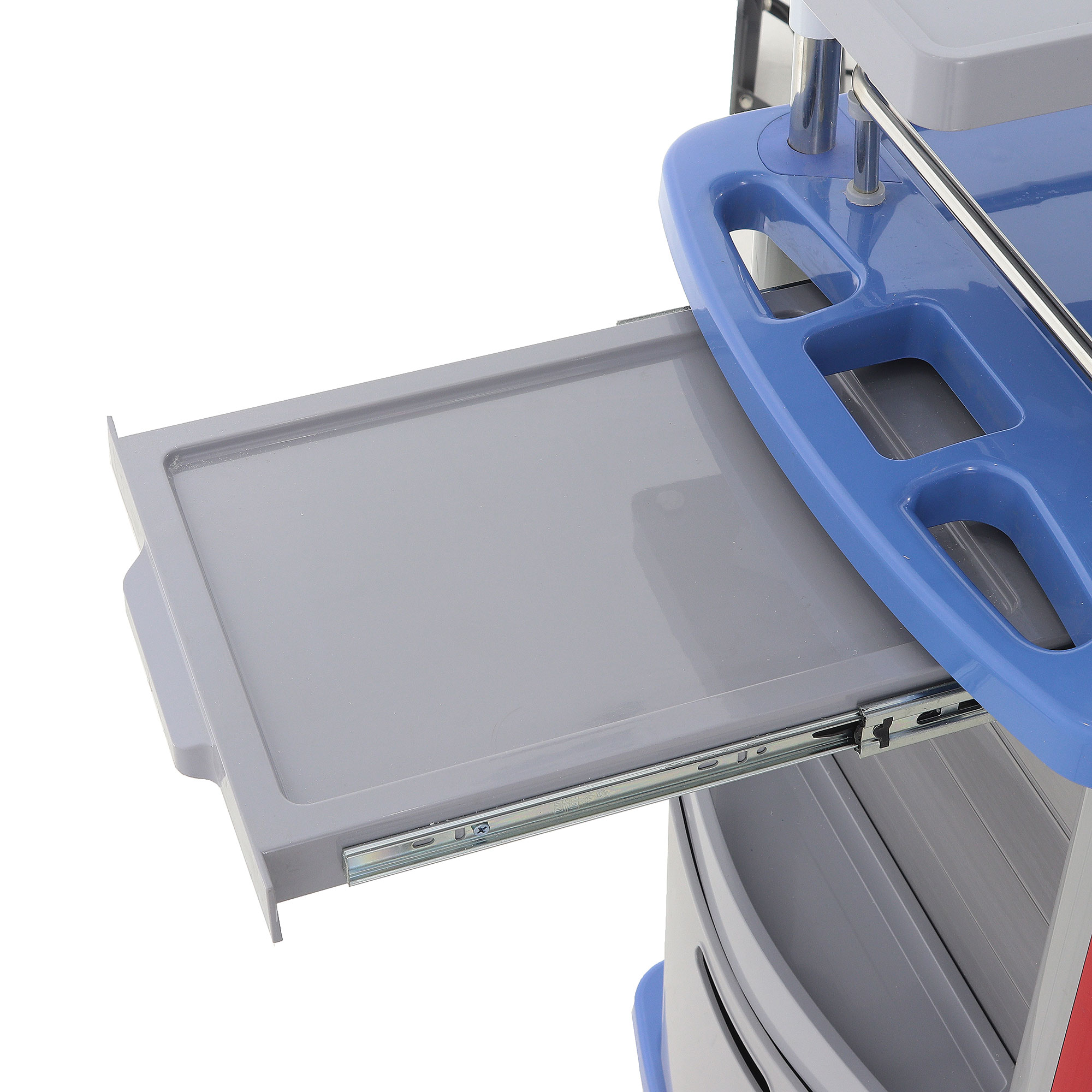 В экстренной медицинской помощи особенно ценится оборудование, которое помогает действовать быстро, уверенно и без лишних движений. Именно поэтому в конструкции предусмотрен поворотный столик для размещения дефибриллятора. Он вращается на 360 градусов и фиксируется в нужном положении, а ремни обеспечивают надежное удержание оборудования. Выдвижная полка под столешницей добавляет еще одну удобную рабочую зону для размещения инструментов или подготовки расходных материалов.