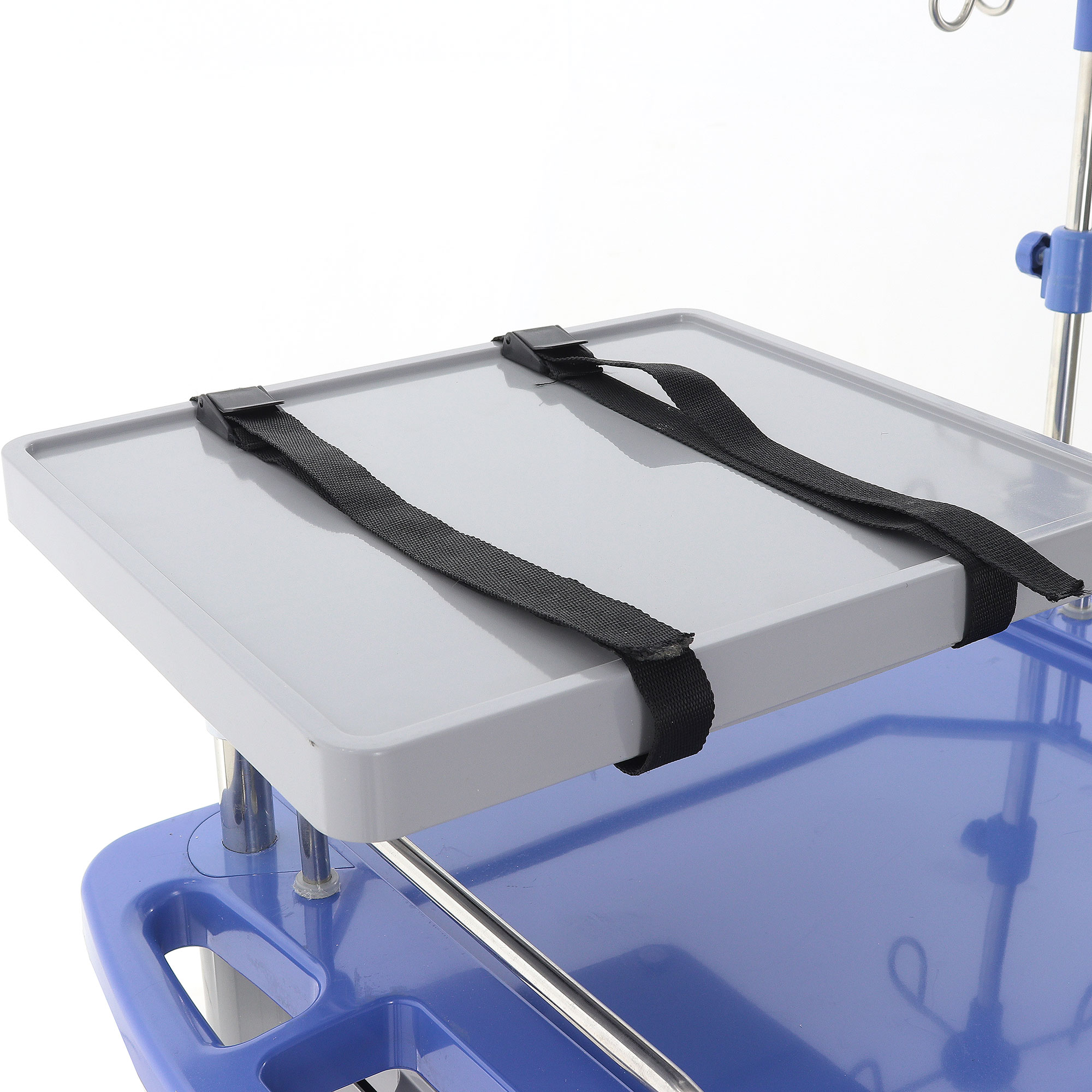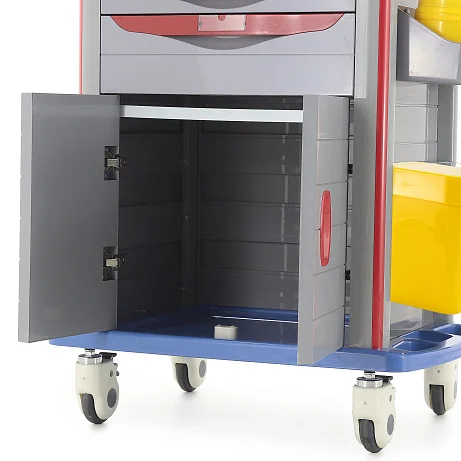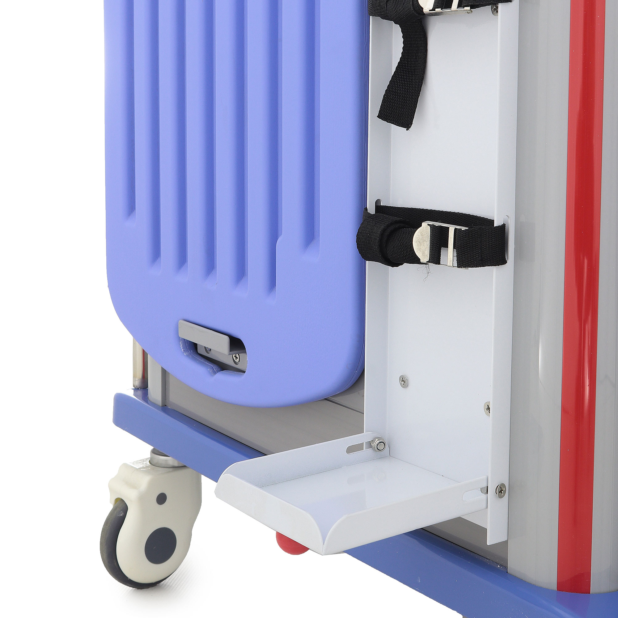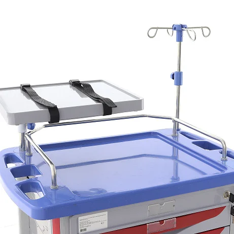 Важно для экстренной медицины: столик-тележка укомплектован поворотным столиком для дефибриллятора с ремнями, доской для СЛР, держателем баллона и розеткой с кабелем. Это делает модель особенно востребованной в реанимационных зонах и кабинетах интенсивной терапии.