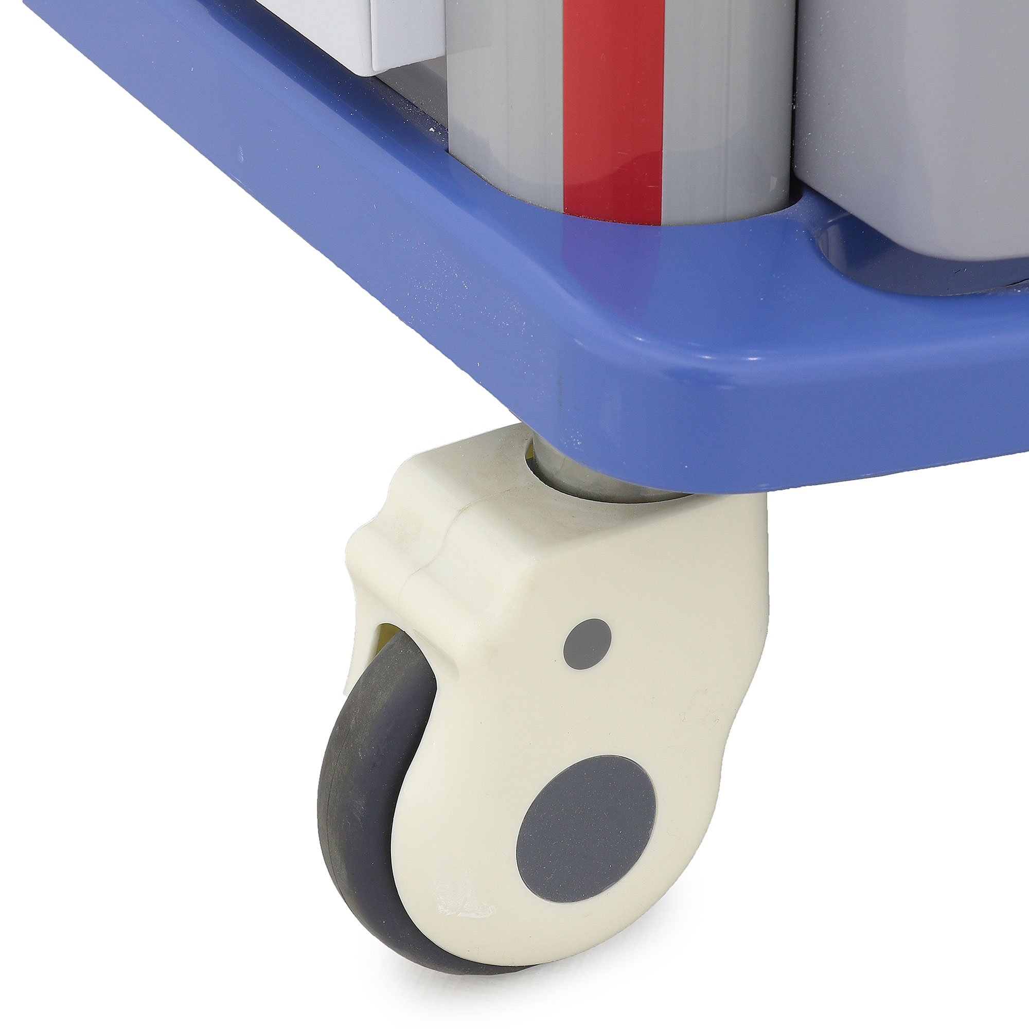 Несмотря на солидную комплектацию, модель остается удобной в ежедневной эксплуатации. Четыре самоориентирующихся колеса обеспечивают плавное перемещение и хорошую маневренность даже в ограниченном пространстве. Полиуретановые шины способствуют мягкому ходу, а тормоза на двух передних колесах помогают надежно зафиксировать столик-тележку в рабочем положении. Это особенно важно в палатах интенсивной терапии, процедурных и приемных отделениях, где оборудование должно перемещаться быстро, но останавливаться точно и безопасно.