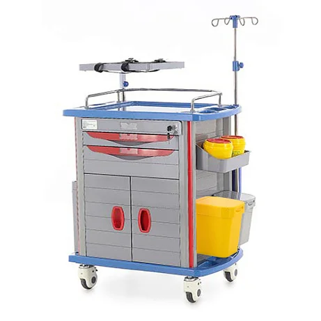 Столик-тележка ЕТ850-02 ТМ-021АН-00 создан для быстрой и слаженной работы в реанимации, на скорой помощи и в процедурных кабинетах. Продуманная компоновка объединяет вместительные ящики с замком, отделение с дверками, поворотный столик для дефибриллятора, выдвижную полку и инфузионную стойку с регулировкой по высоте. Навесные ёмкости, держатель баллона, розетка и доска для СЛР помогают держать всё необходимое под рукой в критический момент. Устойчивая конструкция, манёвренные колёса с тормозами и поверхности, рассчитанные на регулярную дезинфекцию, делают модель надёжным решением для интенсивной медицинской практики.