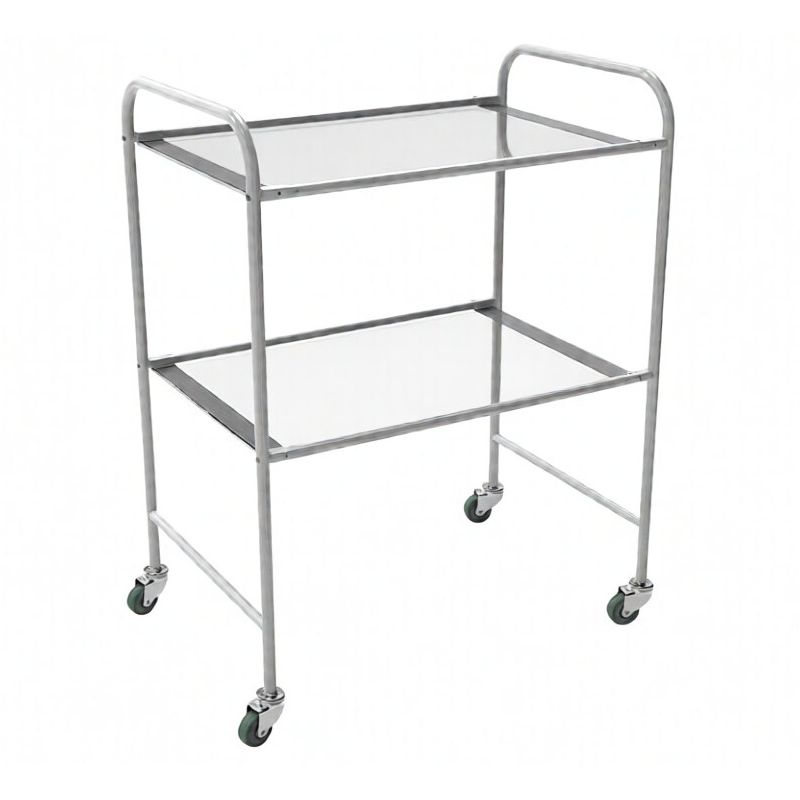 Верхняя часть каркаса одновременно играет роль боковых ручек — удобно, когда нужно быстро подкатить столик ближе к кушетке, операционному столу или зоне подготовки. Нижняя часть усилена перемычками: дополнительная жесткость повышает устойчивость, что особенно важно при активной работе и частом перемещении.