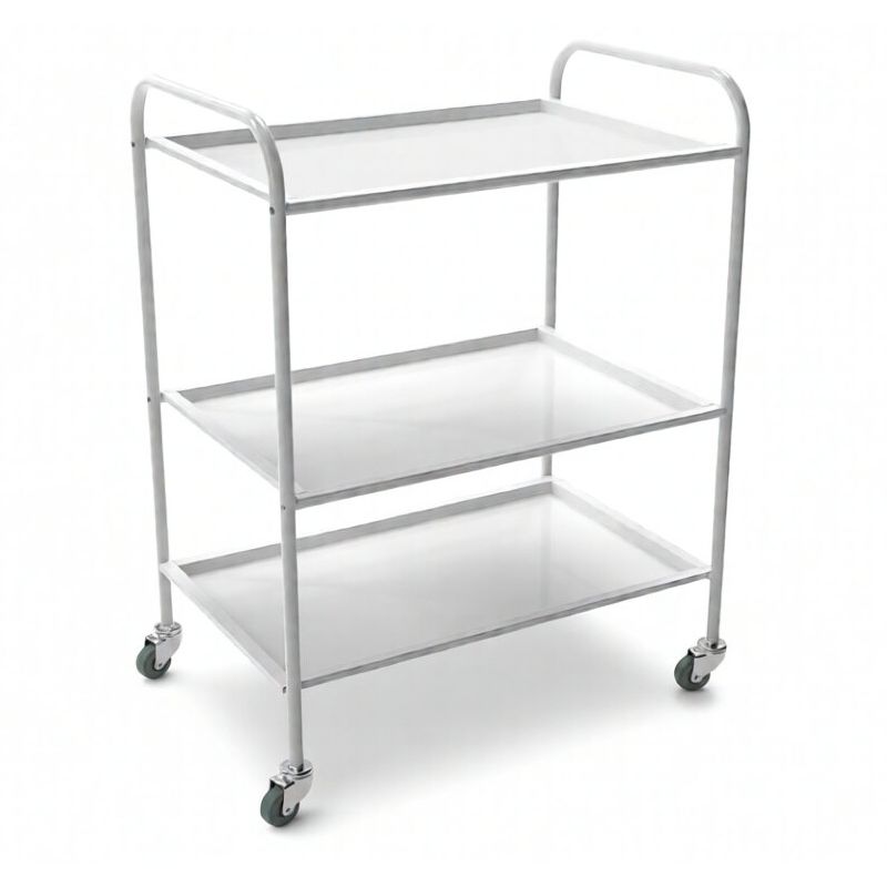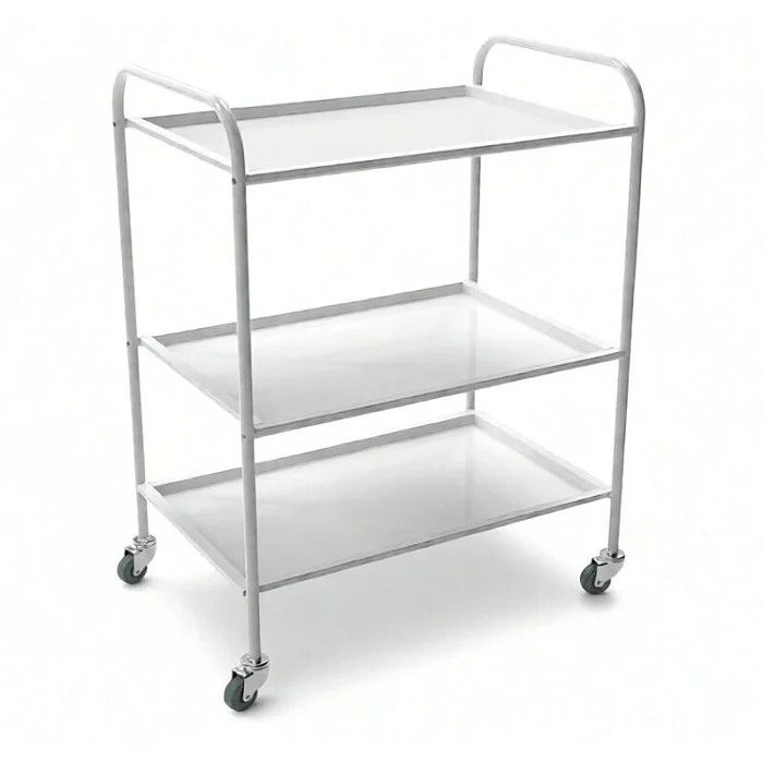 Каркас выполнен П-образным, из стального профиля круглого сечения, с белым полимерно-порошковым покрытием. Это покрытие рассчитано на регулярную эксплуатацию в медицинской среде: устойчиво к повседневным механическим воздействиям и помогает сохранять аккуратный внешний вид тележки в кабинете.