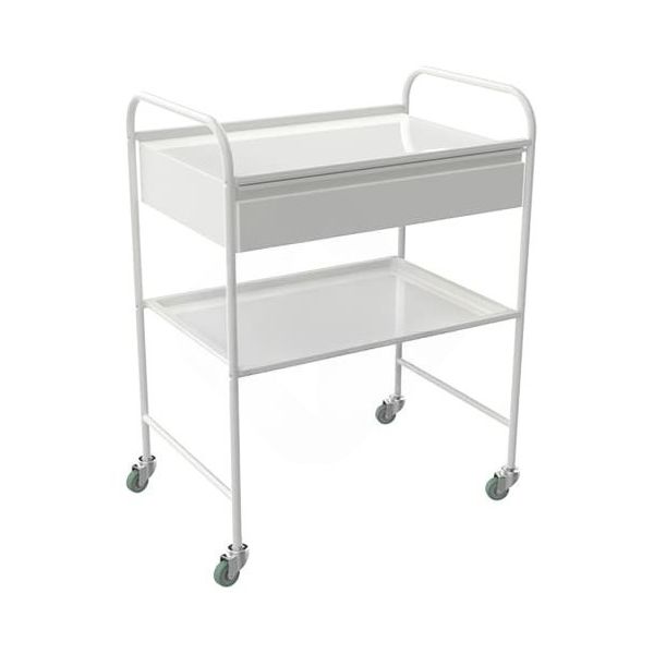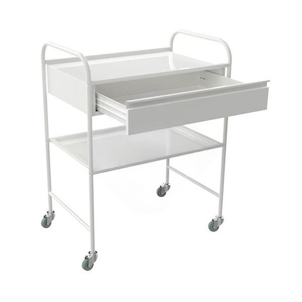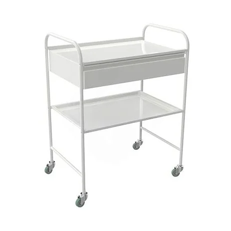Каркас выполнен из металла с порошковым покрытием — это практично для медицинских помещений: поверхность легче поддерживать в аккуратном состоянии, а внешний вид долго остается «чистым» и опрятным. П-образная форма рамы делает доступ к полкам удобным, а верхняя часть каркаса образует боковые ручки: тележку комфортно катить, не касаясь рабочих поверхностей.