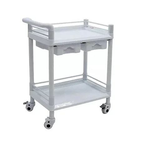 Два колеса снабжены тормозом, поэтому столик можно надежно зафиксировать в нужной точке. Это важно при проведении манипуляций, раскладке инструментов или использовании тележки как мобильной рабочей поверхности рядом с пациентом.