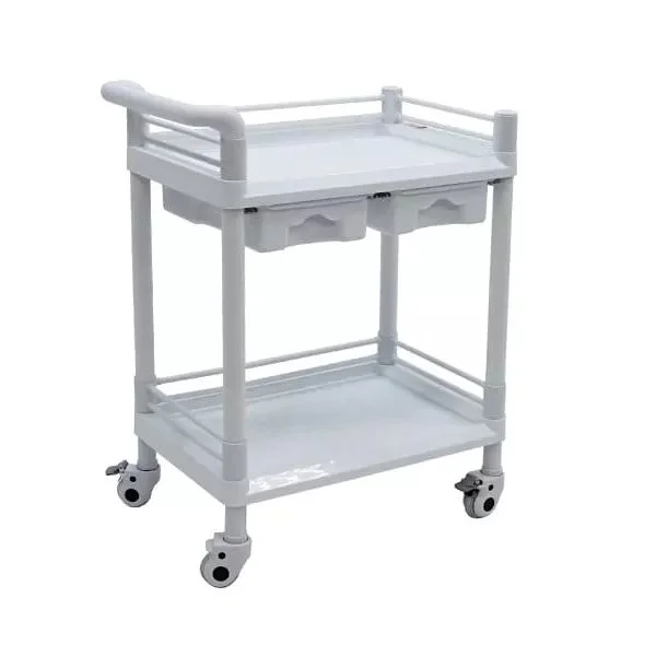Одно из главных преимуществ модели — удачное сочетание открытого и закрытого хранения. Две полки подходят для размещения лотков, упаковок расходных материалов, антисептиков, емкостей и часто используемых принадлежностей. Два выдвижных ящика позволяют держать под рукой более мелкие предметы, которые важно хранить аккуратно, раздельно и в быстром доступе.
