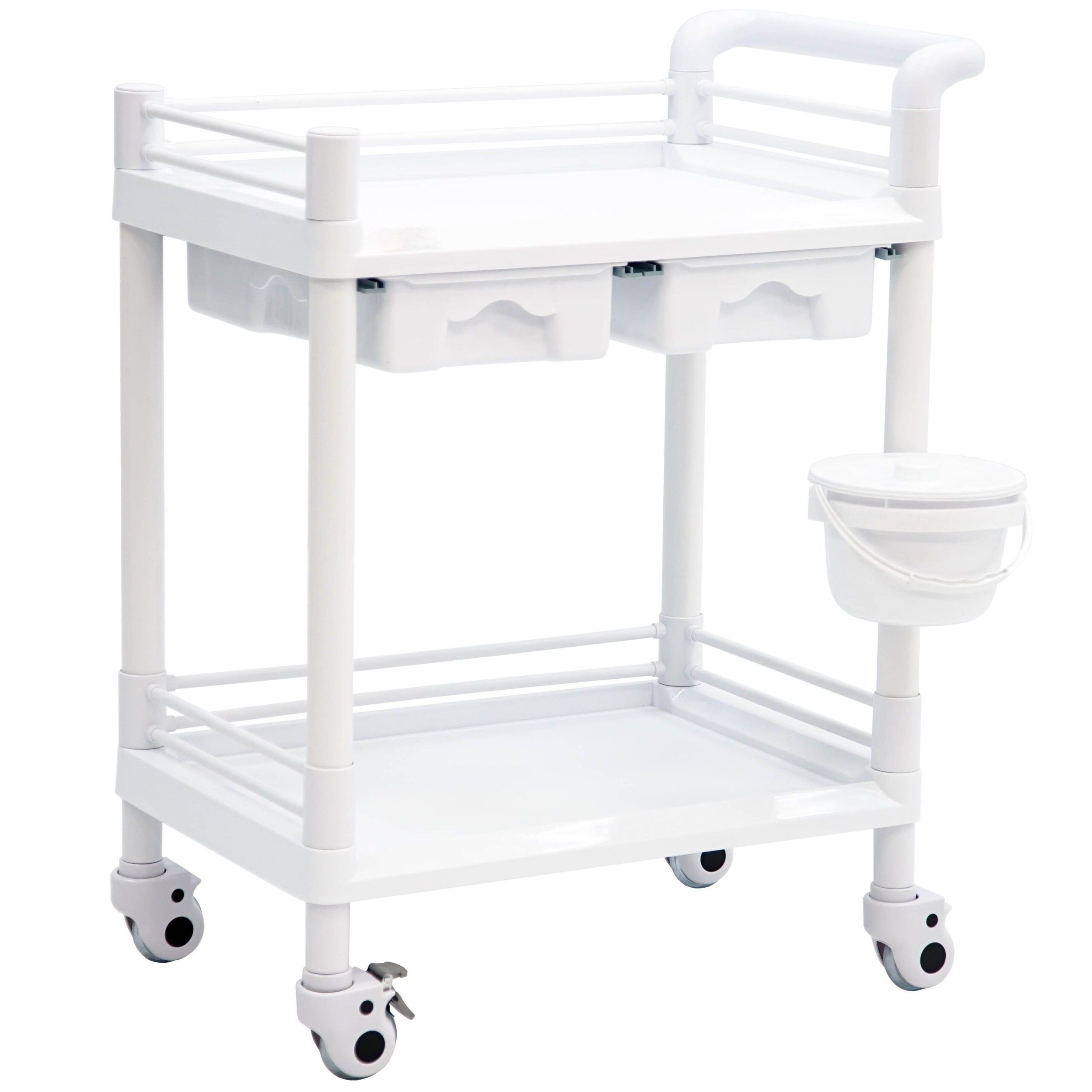 Каркас и топ выполнены из ударопрочного ABS‑пластика с объёмно‑формованным верхом и четырёхсторонней отбортовкой. Три стороны верхней полки имеют высокие ограждения около 85 мм — полезная мелочь, которая спасает лотки от соскальзывания при резком торможении. Кромки тщательно сглажены — без острых углов и труднодоступных щелей. Боковая ручка отвечает за уверенный контроль при манёврах, а держатель под стандартную ёмкость/ведро 2,5 л решает организационный вопрос утилизации отходов прямо «на колёсах».