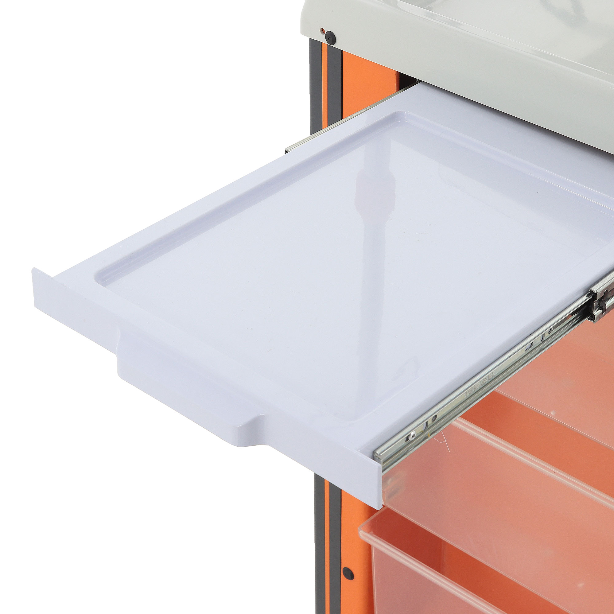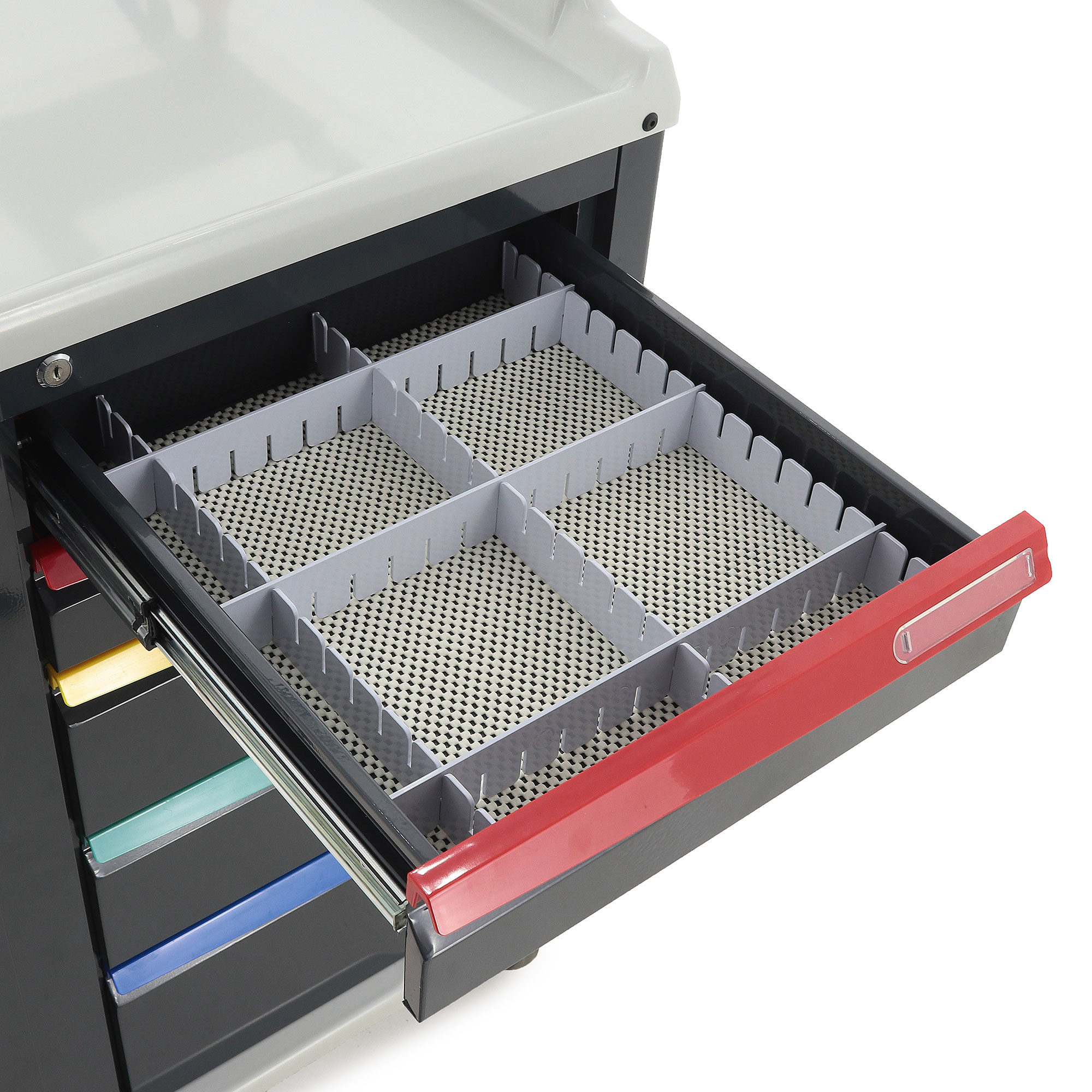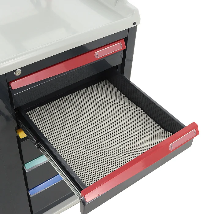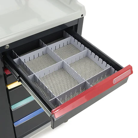 Ящики установлены на телескопические направляющие с доводчиками, поэтому открываются плавно и закрываются мягко, без резких ударов. На первом ящике установлен замок, что удобно для хранения препаратов и материалов, доступ к которым должен быть ограничен. Цветовая маркировка ручек дополнительно упрощает визуальную навигацию и помогает персоналу быстрее ориентироваться в содержимом.