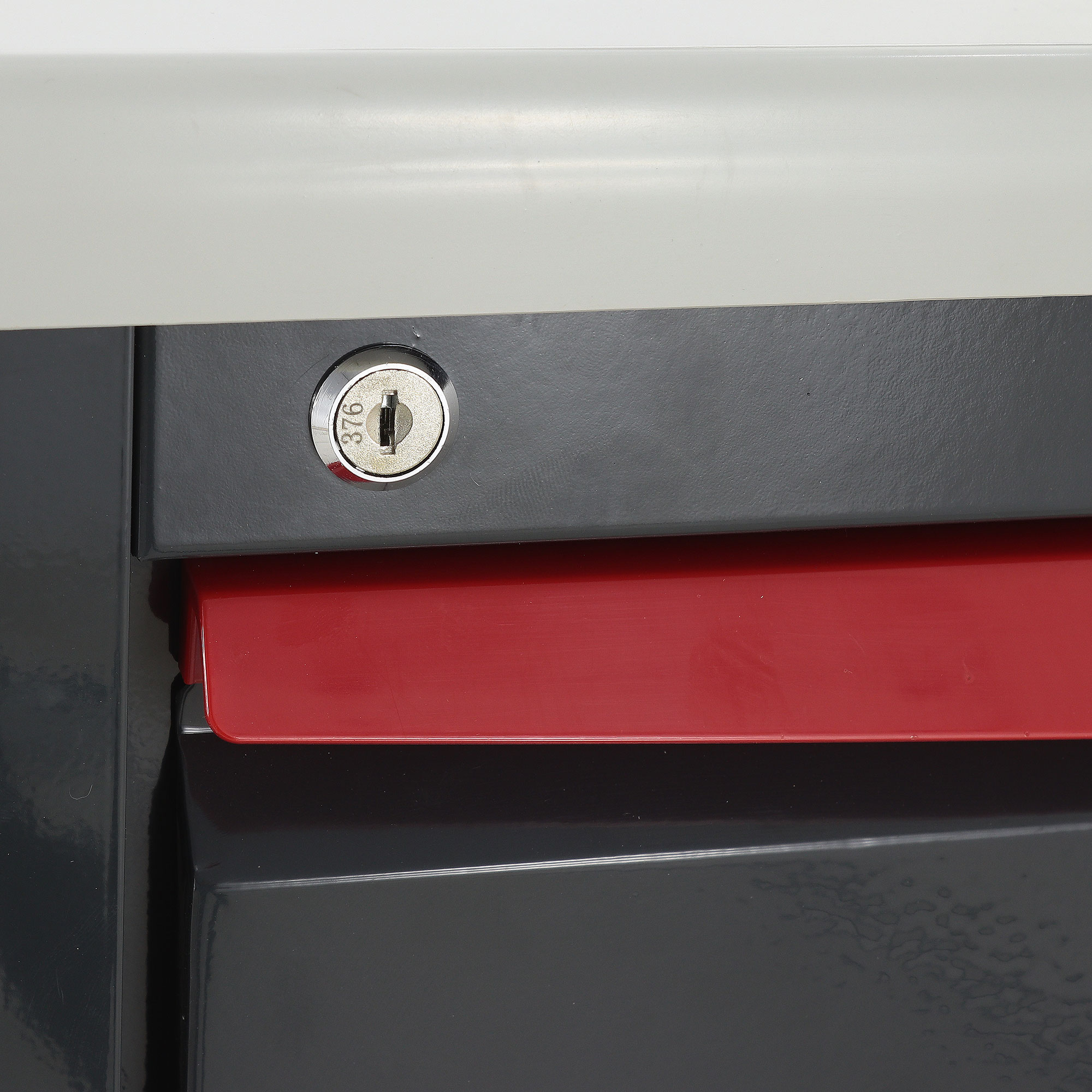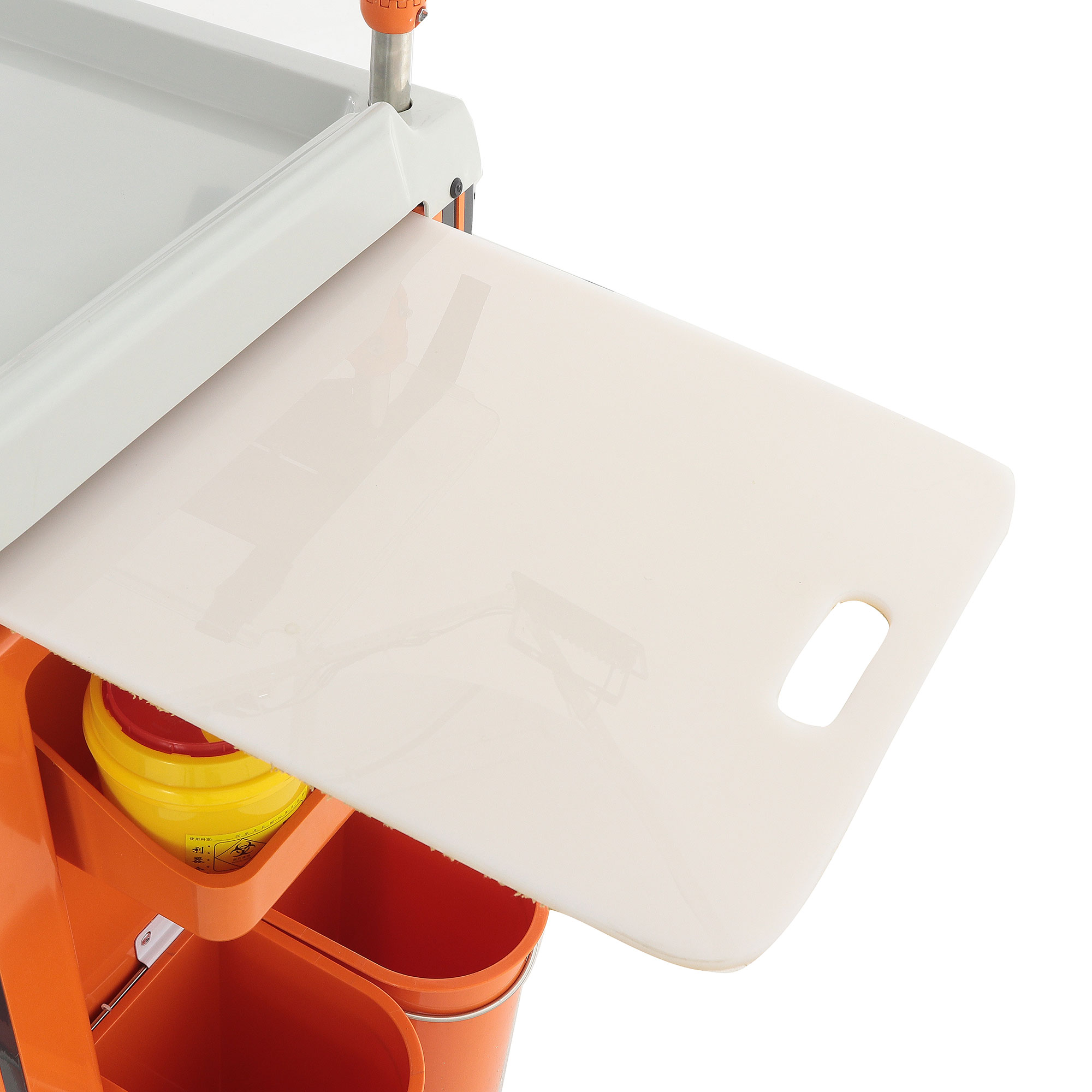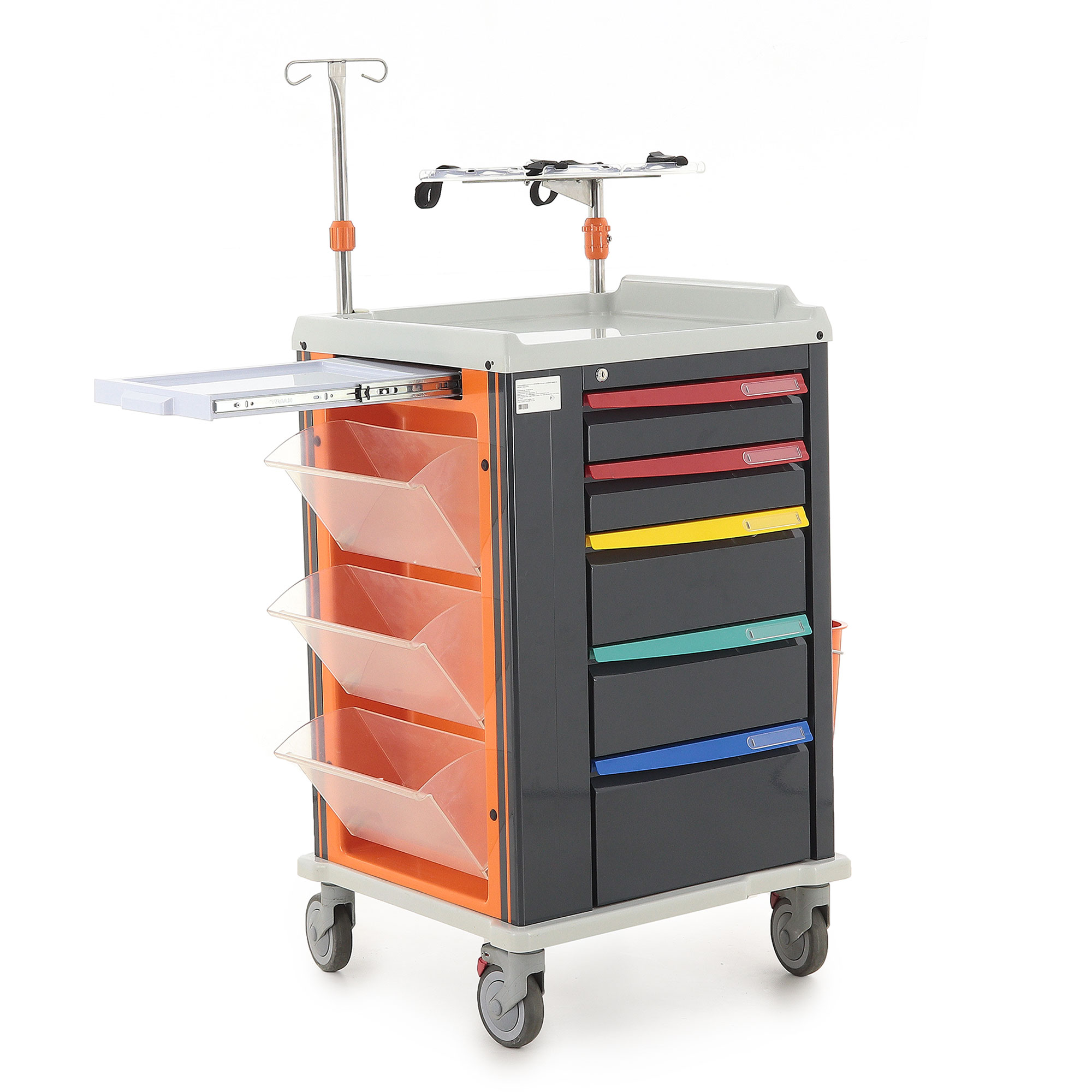 Ящики установлены на телескопические направляющие с доводчиками, поэтому открываются плавно и закрываются мягко, без резких ударов. На первом ящике установлен замок, что удобно для хранения препаратов и материалов, доступ к которым должен быть ограничен. Цветовая маркировка ручек дополнительно упрощает визуальную навигацию и помогает персоналу быстрее ориентироваться в содержимом.