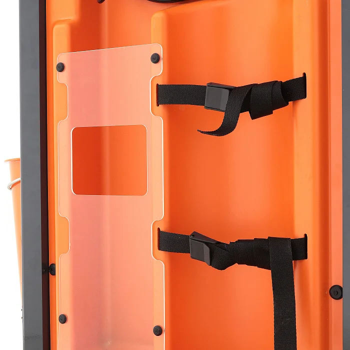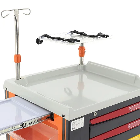 Под столешницей размещены доска для сердечно-лёгочной реанимации и выдвижная полка. Такое решение экономит место и при этом сохраняет быстрый доступ к важным элементам. На задней стенке установлен держатель баллона с двумя ремнями, а также розетка с кабелем длиной 2,8 метра, что особенно удобно при подключении оборудования в условиях динамичной работы.