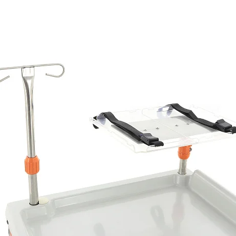 Столик-тележка укомплектован элементами, которые действительно востребованы в экстренной практике. Поворотный столик с возможностью вращения на 360° подходит для размещения дефибриллятора или другой аппаратуры, а два фиксирующих ремня помогают надежно удерживать оборудование при перемещении. Инфузионная стойка с бесступенчатой регулировкой высоты от 1200 до 1900 мм позволяет быстро адаптировать рабочее место под конкретную задачу и размещение инфузионных систем.