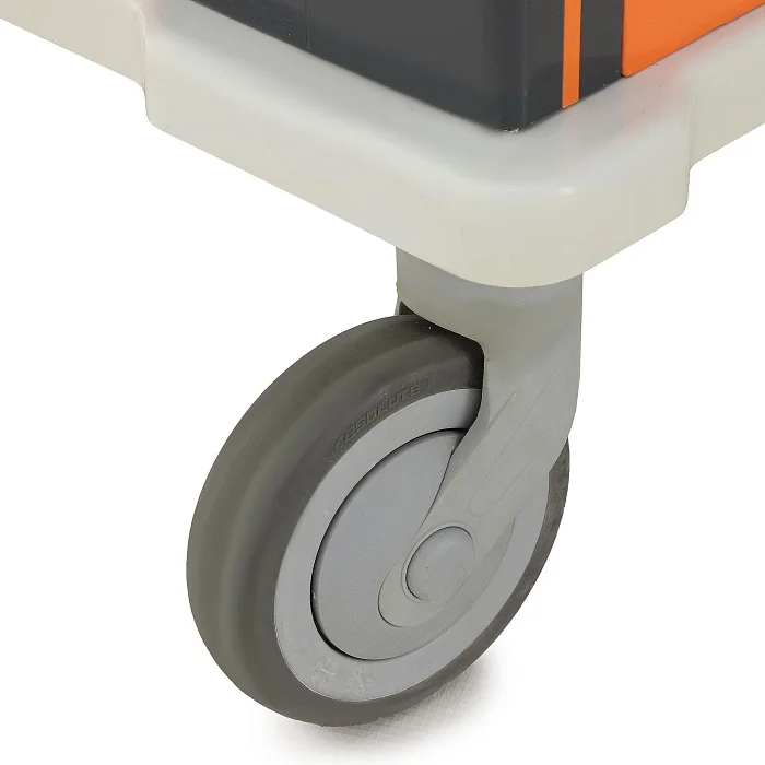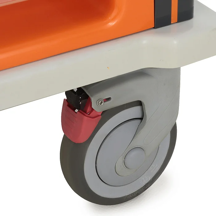 Для медицинской мебели экстренного назначения мобильность имеет принципиальное значение. Модель установлена на четыре самоориентирующихся колеса рояльного типа с полиуретановыми шинами диаметром 125 мм. Столик-тележка уверенно перемещается по различным типам напольных покрытий, сохраняет хорошую маневренность в узких проходах и легко позиционируется рядом с пациентом. Наличие тормозов на двух передних колсах с блокировкой поворота повышает устойчивость во время выполнения процедур и исключает самопроизвольное смещение.