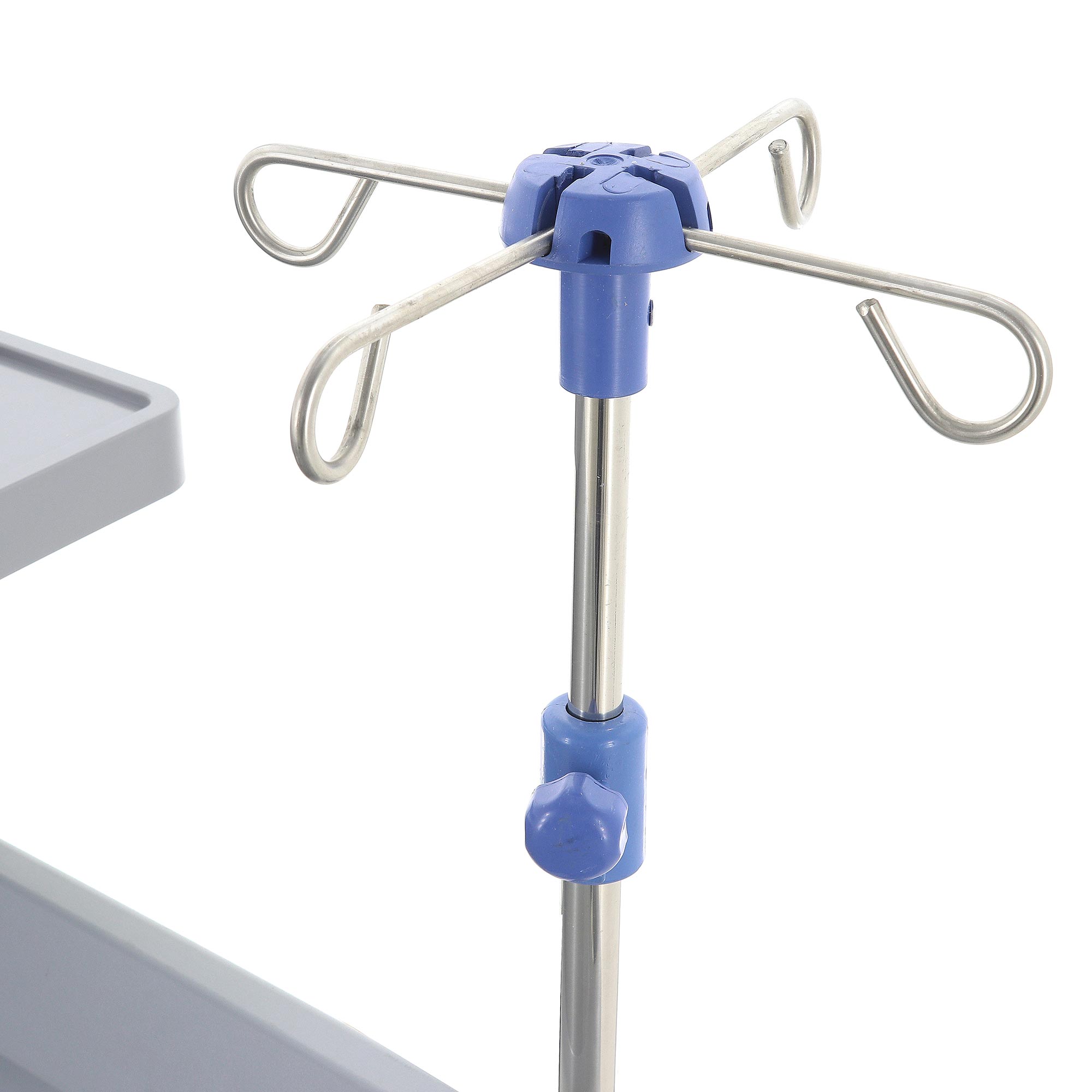 Инфузионная стойка с четырьмя крючками регулируется по высоте в широком диапазоне, что делает столик-тележку универсальным для разных сценариев инфузионной терапии. На задней стенке размещены доска для сердечно-лёгочной реанимации, держатель кислородного баллона и розетка с кабелем длиной 2,5 метра. Такое оснащение позволяет использовать модель как полноценный мобильный реанимационный пост.