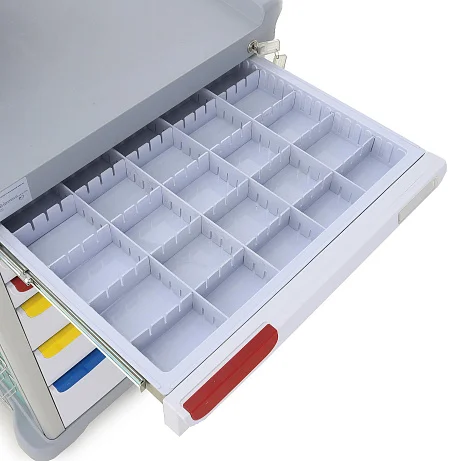Главная особенность модели — не просто наличие ящиков и полок, а логично выстроенная система хранения. Шесть выдвижных ящиков позволяют распределить содержимое по категориям, а 36 съёмных перегородок помогают адаптировать внутреннее пространство под конкретные задачи отделения. Это удобно в ежедневной практике: персоналу проще поддерживать порядок, быстрее находить нужные материалы и сокращать время подготовки к манипуляциям.