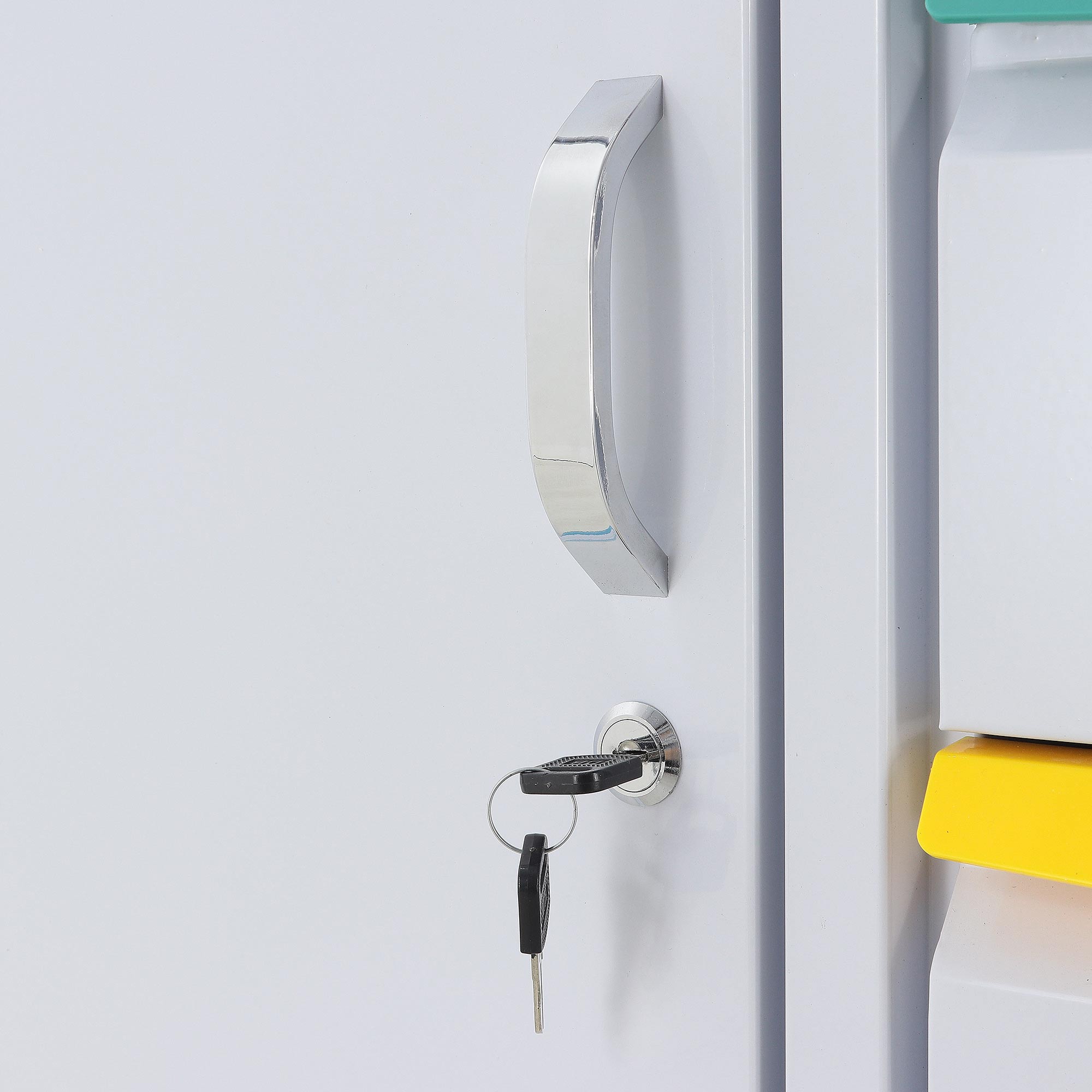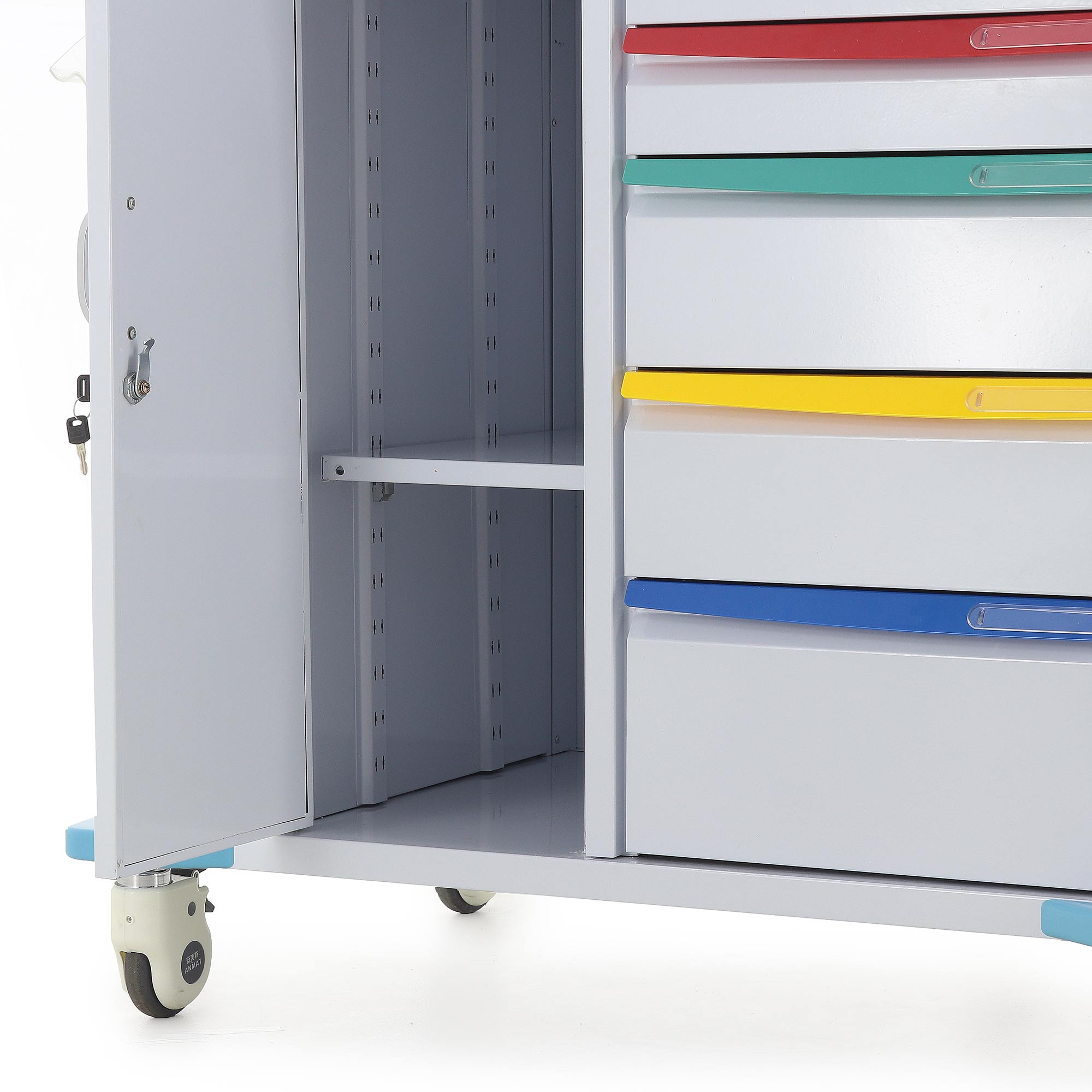 Помимо ящиков, столик-тележка оснащён отдельным отделением с дверкой и переставной полкой. Это удобное решение для размещения более крупных упаковок, расходных материалов, флаконов, контейнеров и оборудования, которое должно храниться закрыто и отдельно. Наличие замка повышает уровень безопасности и помогает ограничить доступ к содержимому.