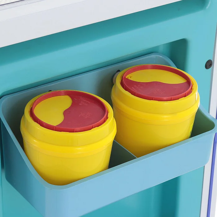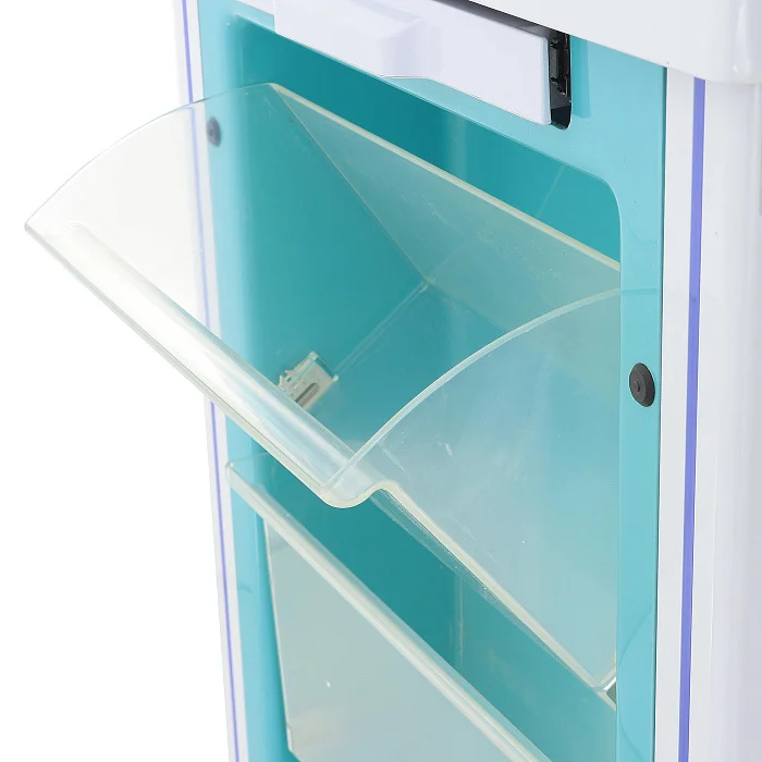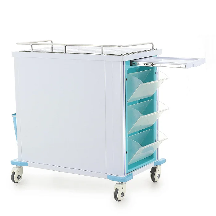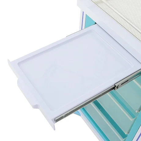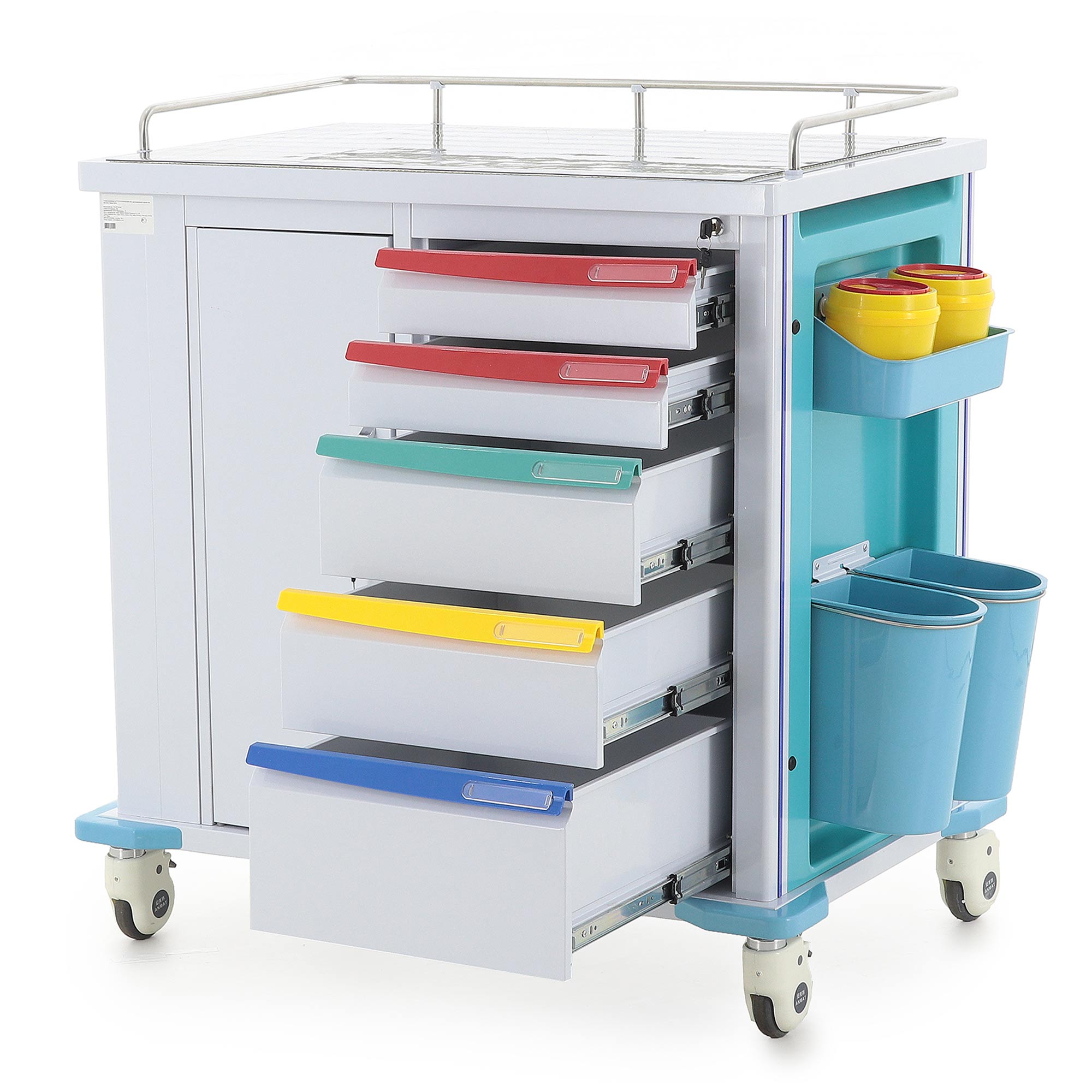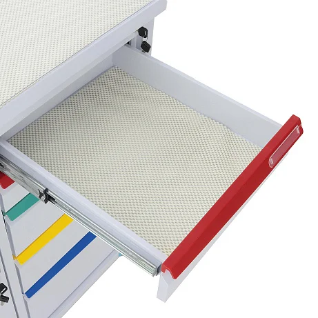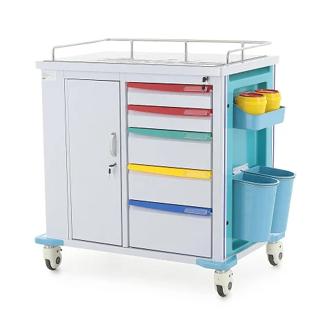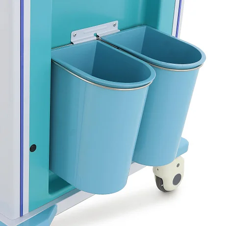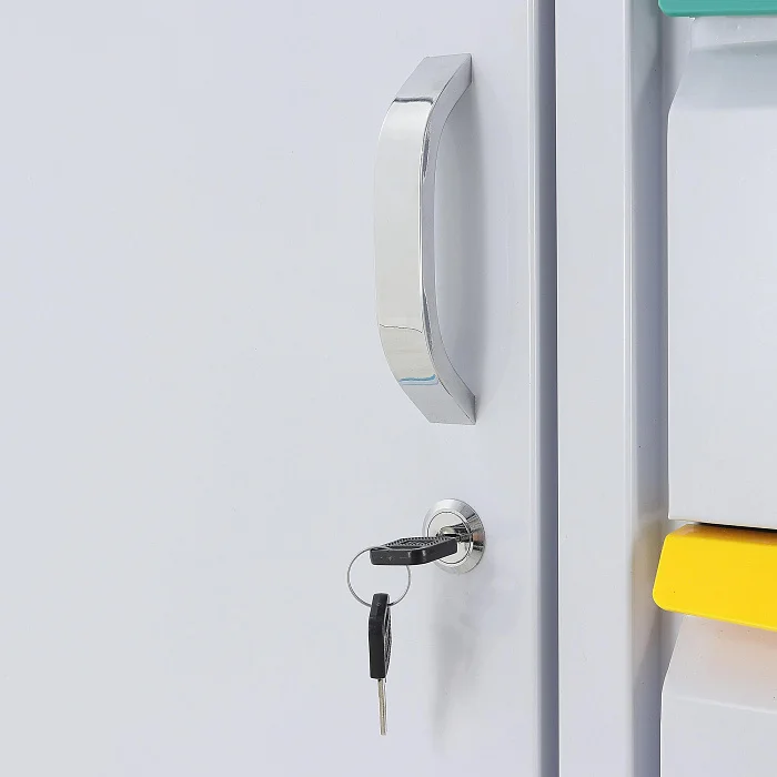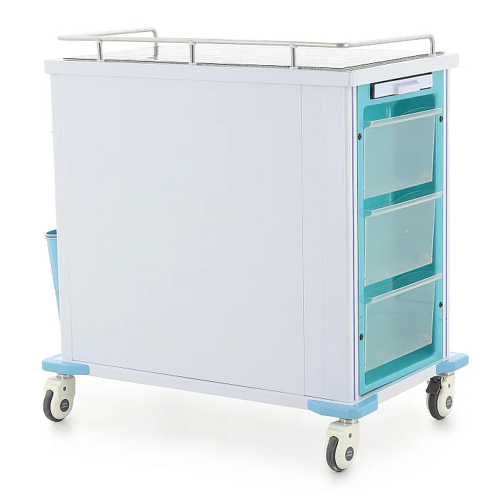 Конструкция выполнена в современном медицинском дизайне: бело-серый корпус дополнен бирюзовыми элементами, а разноцветные ручки ящиков упрощают визуальную навигацию. Это не просто эстетическая деталь, а удобный инструмент в повседневной работе, когда персоналу важно быстро находить нужный отсек без лишних движений.