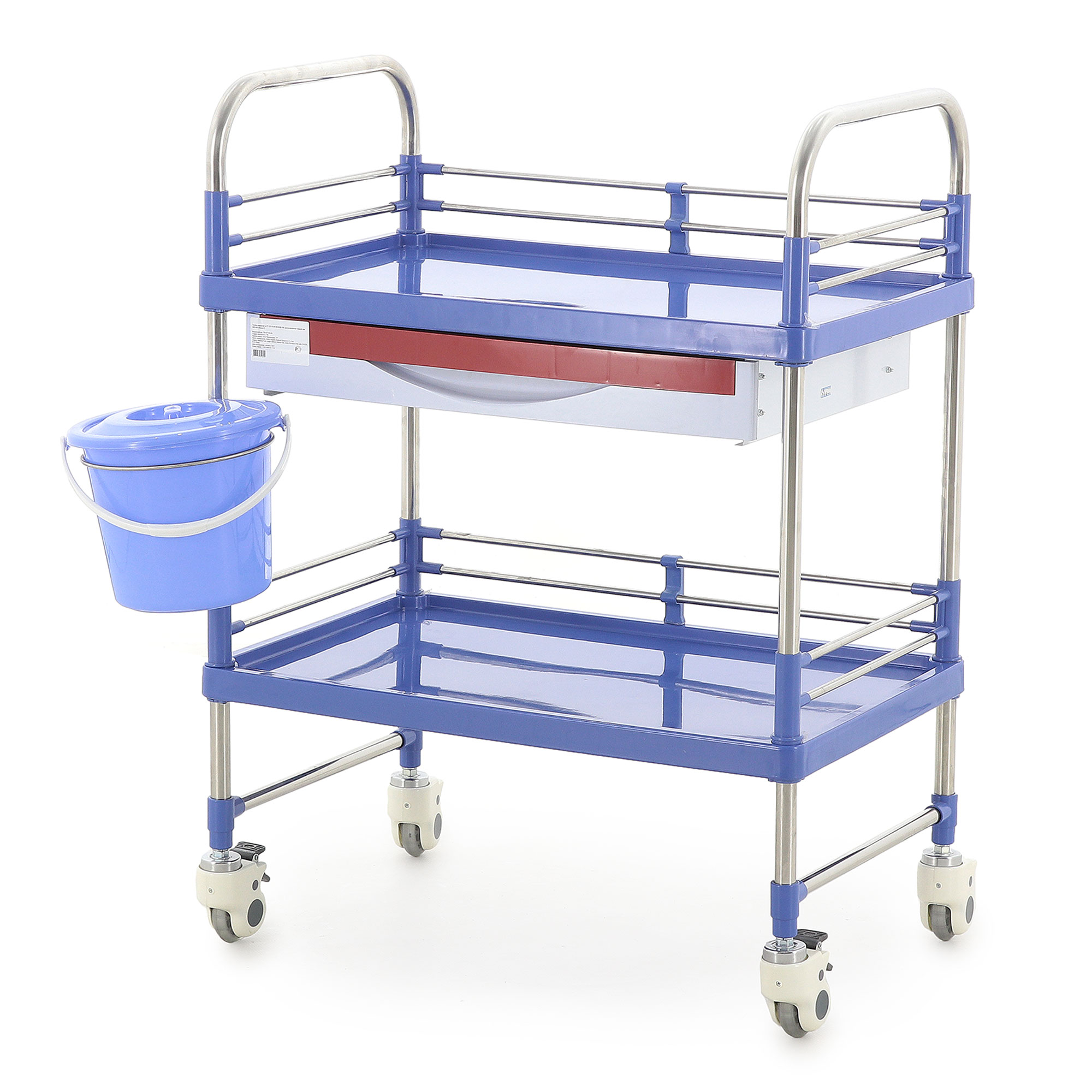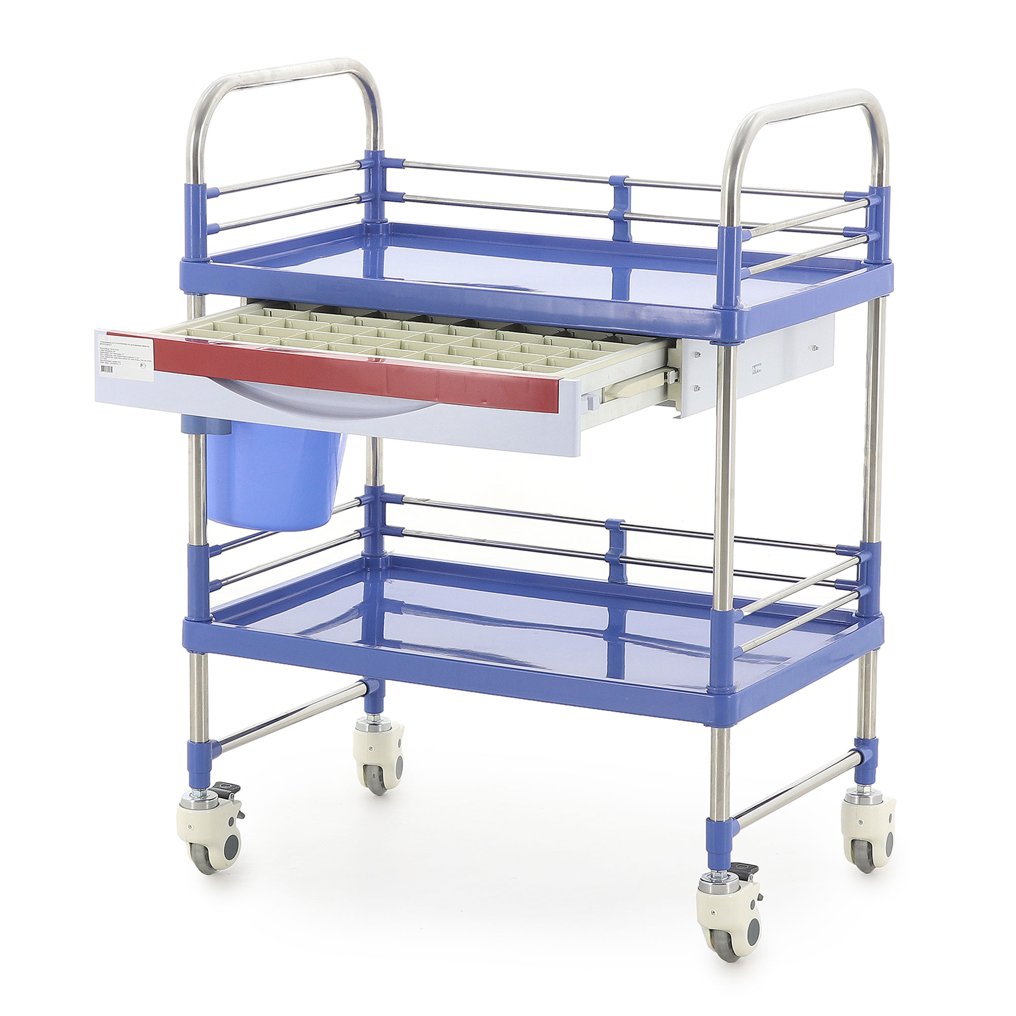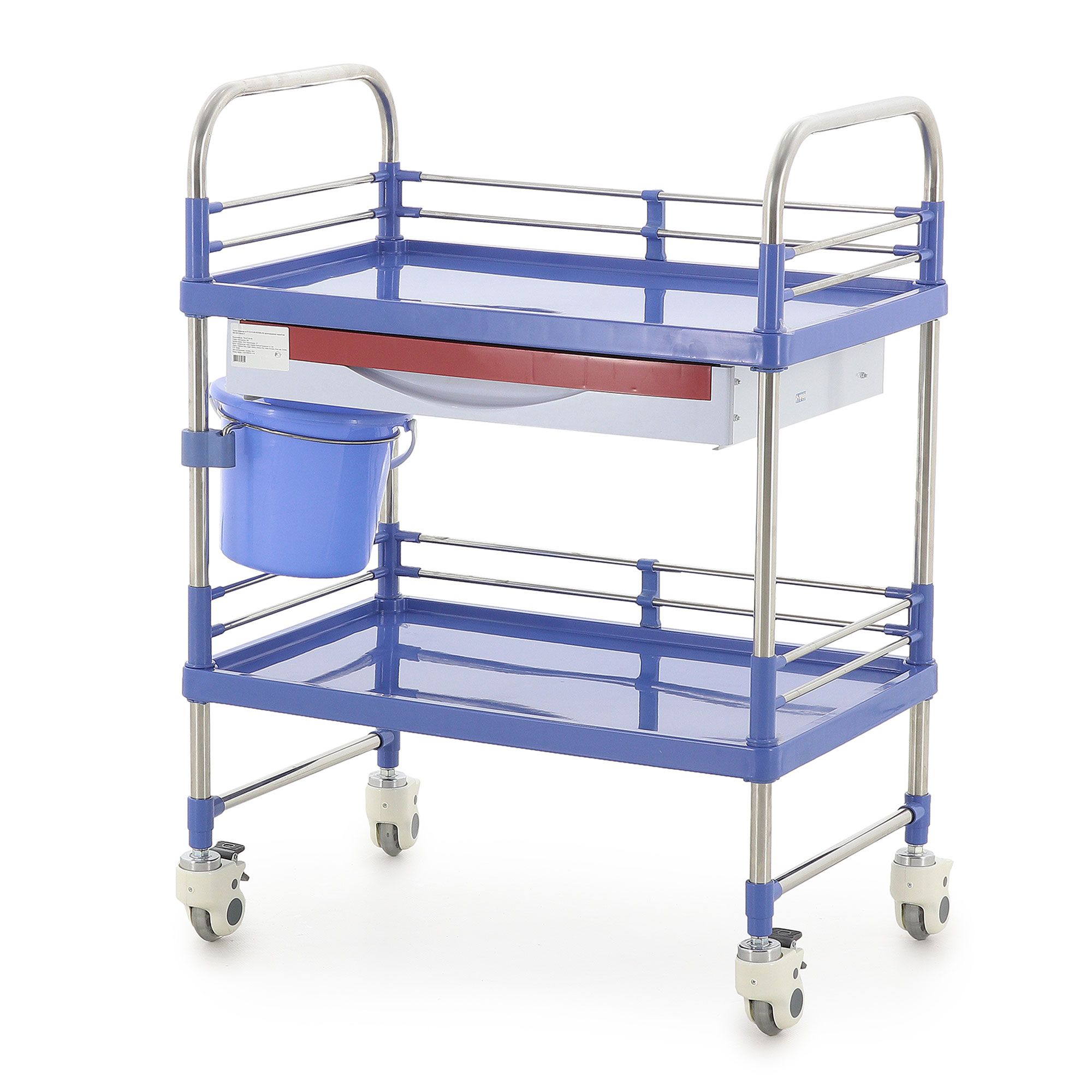 Столик-тележка изготовлен с учётом требований медицинской среды. Каркас выполнен из нержавеющей стали, что обеспечивает устойчивость конструкции, долговечность и аккуратный внешний вид аже при регулярной санитарной обработке. Основание и столешница изготовлены из прочного пластика синего цвета, удобного в уходе и устойчивого к воздействию дезинфицирующих средств.