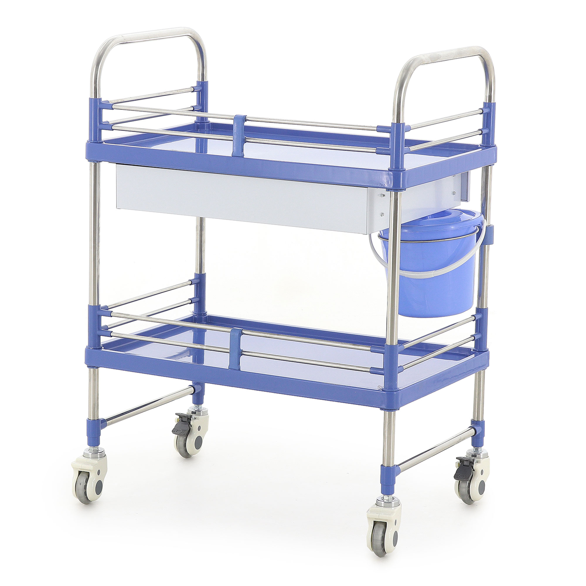 Оба яруса оснащены П-образными двухъярусными ограждениями из нержавеющей стали высотой 80 мм. Они помогают надёжно удерживать размещённые предметы при перемещении столика-тележки по кабинету или между помещениями. Это особенно важно при транспортировке стерильных упаковок, флаконов, инструментальных наборов и других принадлежностей, которые должны оставаться на своих местах без риска случайного падения.