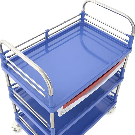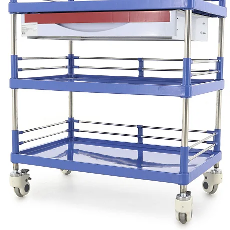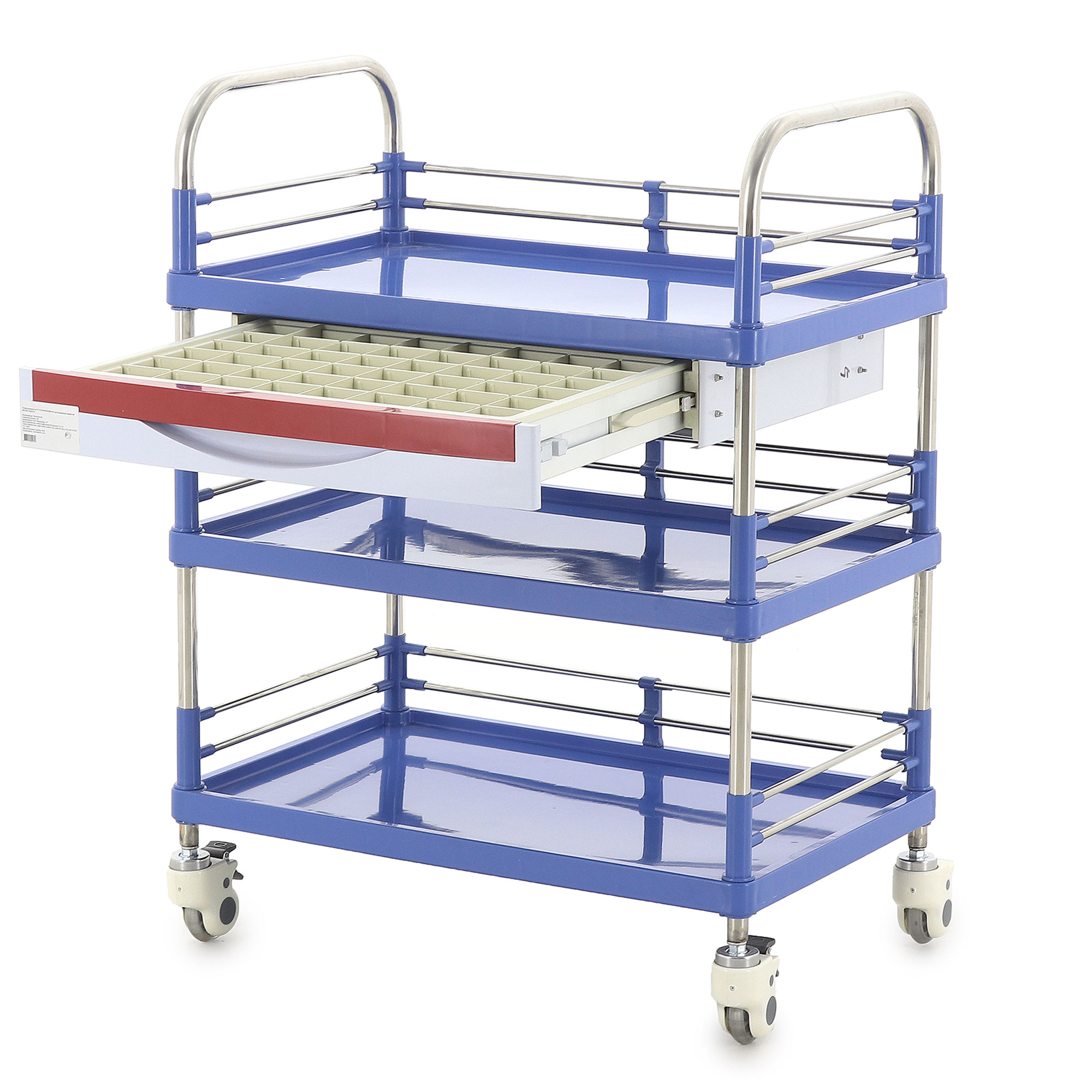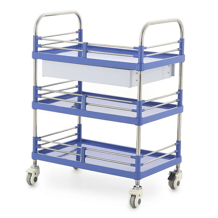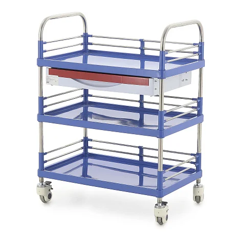 Столик-тележка С4 TM-018AH-00 — удобное решение для оснащения процедурных, перевязочных и других медицинских кабинетов. Модель подходит для манипуляционных и инструментальных задач, помогая держать всё необходимое под рукой и поддерживать порядок на рабочем месте. Три яруса с двухуровневыми ограждениями, выдвижной ящик с защёлкой и съёмный лоток с ячейками делают её практичной в ежедневной работе. Прочная конструкция из нержавеющей стали и пластика устойчива к дезинфекции, а колёса с тормозами обеспечивают лёгкое перемещение и надёжную фиксацию.