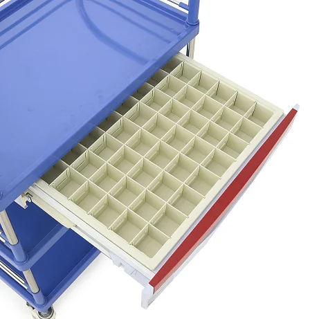 Дополнительное преимущество конструкции — выдвижной ящик на телескопических направляющих. Он открывается плавно и обеспечивает удобный доступ к содержимому даже при плотной загрузке. Внутри предусмотрен съёмный лоток с перегородками, рассчитанный до 48 ячеек, что делает модель особенно полезной для аккуратного размещения мелких предметов, ампул, расходников и инструментальных принадлежностей. Наличие защёлки повышает безопасность хранения и помогает избежать случайного открытия ящика во время перемещения.
