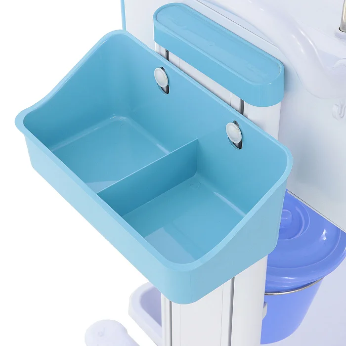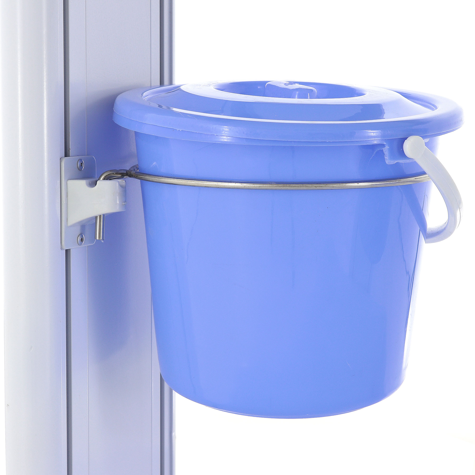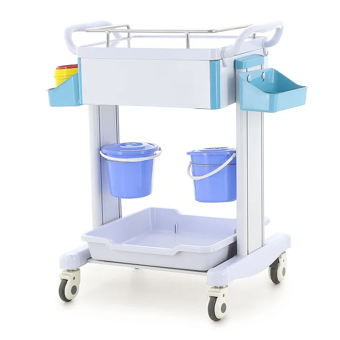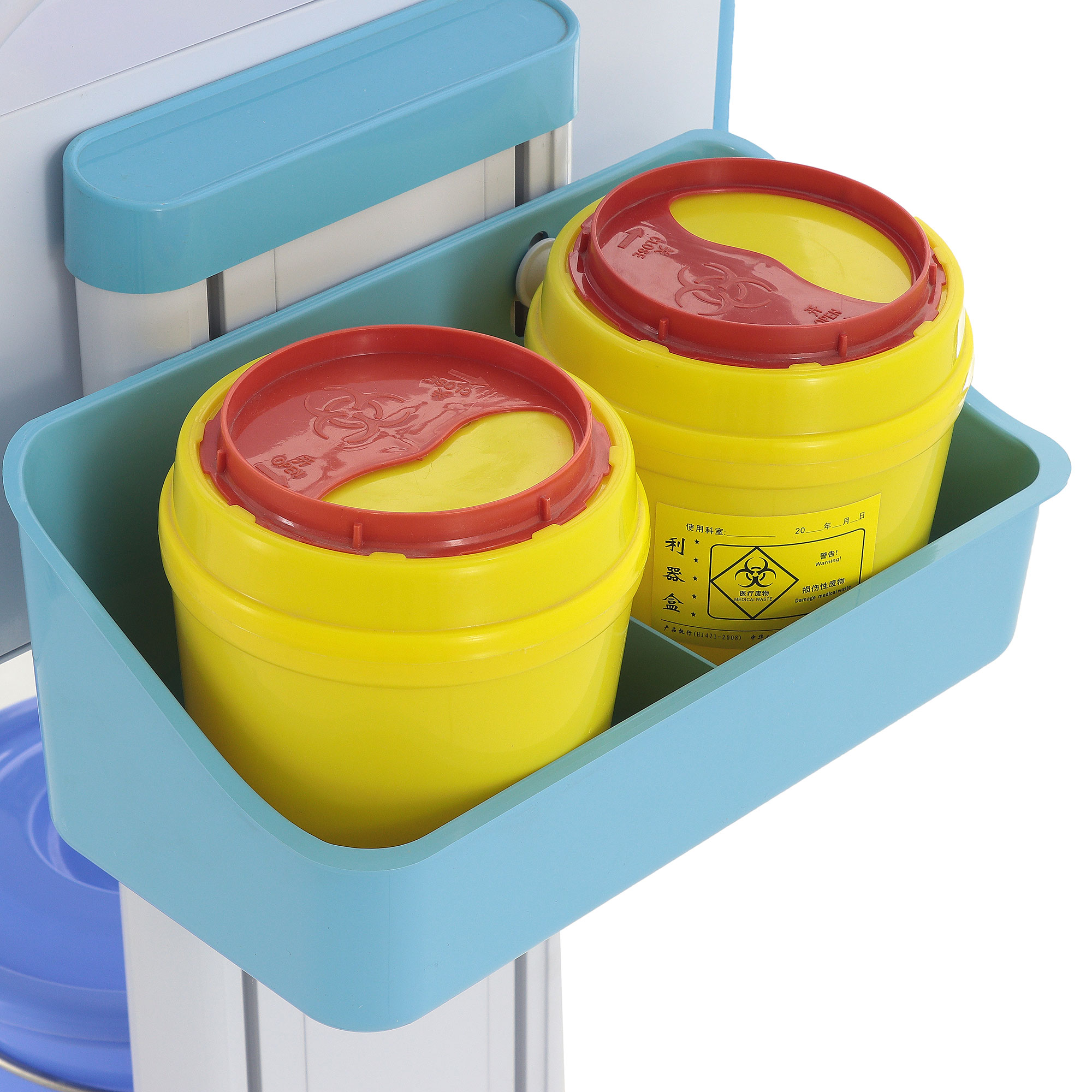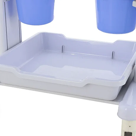 Модель укомплектована шестью навесными ёмкостями, благодаря чему медицинский персонал может грамотно разделить расходные материалы, инструменты и вспомогательные принадлежности. В комплект входят два ведра с крышками, две банки и два лотка. Такое решение помогает организовать рабочее место логично и удобно: одни элементы используются для временного хранения, другие — для быстрого доступа к часто применяемым материалам.