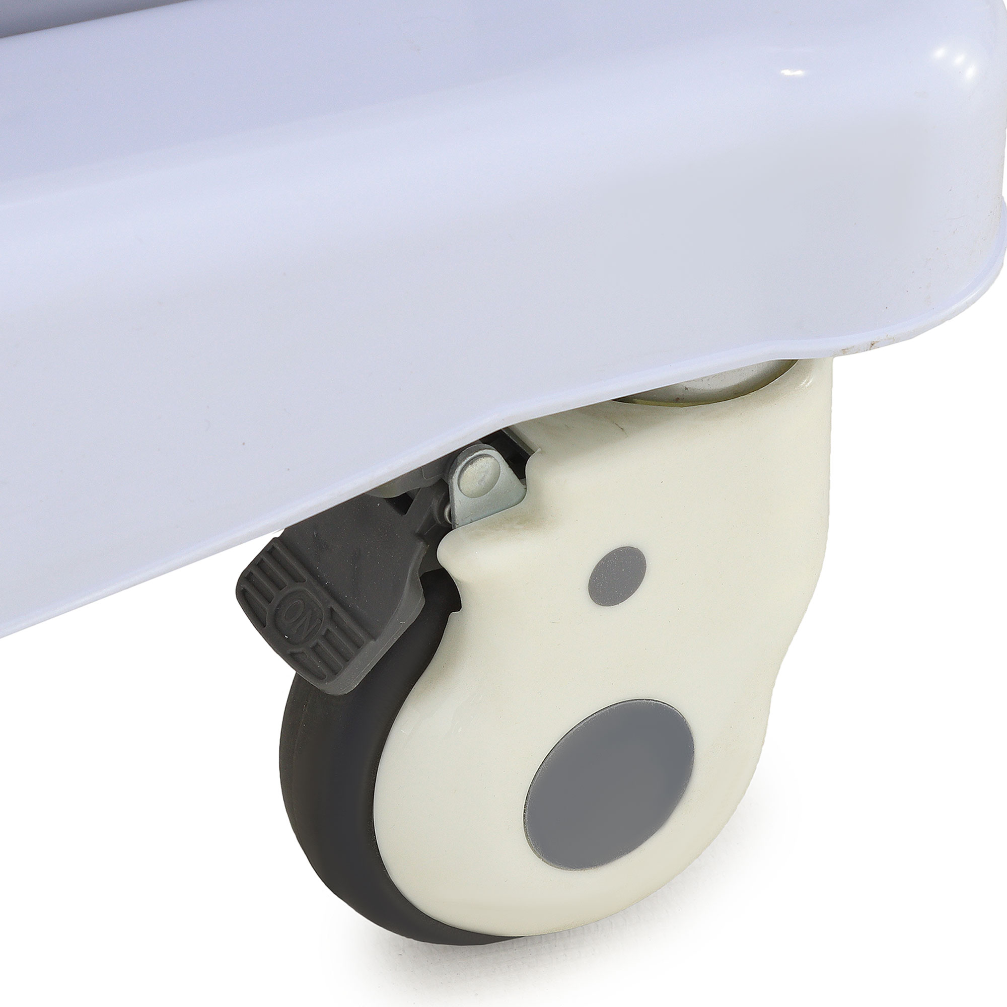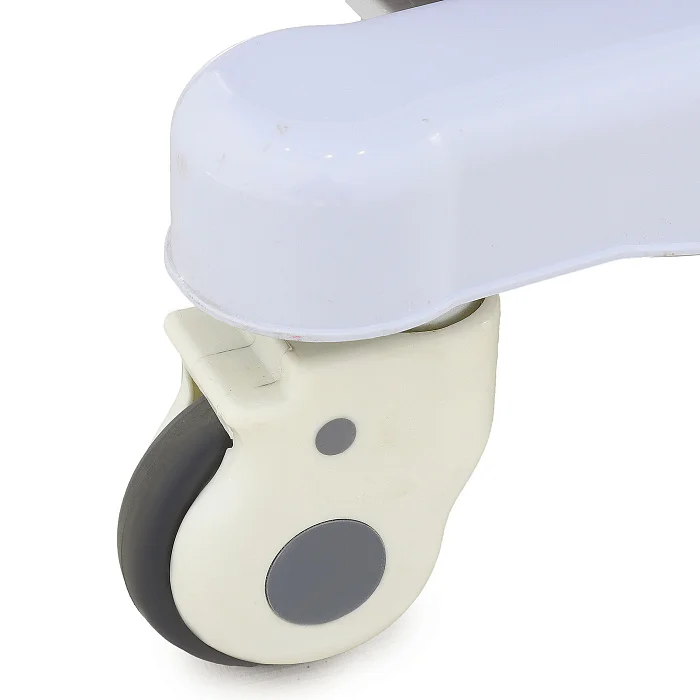 Четыре самоориентирующихся колеса диаметром 99 мм обеспечивают плавный ход, а полиуретановые шины помогают снизить шум и улучшают управляемость. На двух передних колесах предусмотрен индивидуальный тормоз с блокировкой поворота — это важная деталь для безопасной фиксации столика-тележки в рабочем положении во время процедур.