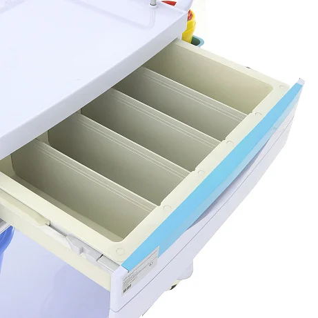 Выдвижной ящик на телескопических направляющих обеспечивает быстрый доступ к инструментам, перевязочным материалам, медикаментам и мелким принадлежностям. Внутреннее пространство ящика можно организовать с помощью четырёх перегородок, что особенно удобно, когда важно поддерживать строгий порядок и сократить время на поиск нужной позиции. Дополнительный несъёмный лоток-полка в основании подходит для хранения более объёмных предметов, упаковок и расходников, которые должны быть всегда под рукой.