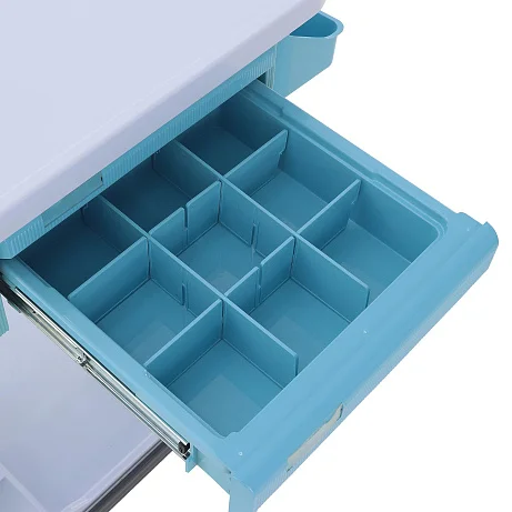 Габариты 965×525×993 мм делают столик-тележку достаточно вместительным, но при этом не громоздким. Он уверенно вписывается в пространство процедурного кабинета, перевязочной, терапевтического поста или манипуляционной зоны. За счет сочетания ящиков, лотка и навесных ведер модель помогает разделять принадлежности по категориям: инструменты, расходные материалы, упаковку, вспомогательные средства и предметы ежедневного пользования.