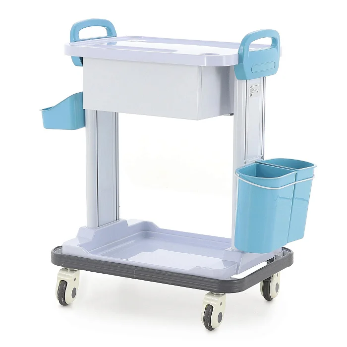 Дополнительные навесные емкости делают модель особенно удобной в реальной клинической практике. Два ведра без крышек и боковой лоток позволяют отдельно размещать расходники, вспомогательные принадлежности и предметы, которые должны быть быстро доступны во время манипуляций. Такая компоновка помогает персоналу работать собранно, аккуратно и без лишних движений.