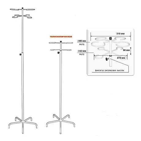 Благодаря небольшим размерам опор штатив может использоваться в любом помещении. Стойка для капельницы имеет небольшой вес, наличие 5-лучевой опоры делает изделие устойчивым.