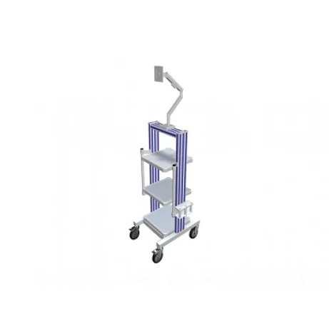 Фармация УМТ2-34 (держатель жест. эндоскопов, поворотн. держатель монитора) представляет собой эндоскопическую стойку для подключении оборудования. Модель отлично подходит для оснащения медицинских кабинетов. Она сочетает в себе высокую функциональность и надежность. Каркас выполнен из конструкционного алюминия, что гарантирует высокую жесткость изделия. Дополнительно в конструкции присутствует 3 полки из оцинкованной стали с порошковым защитным покрытием. По бокам стойки установлены рукоятки для транспортировки, углы защищают специальные бамперы. Дополнительно модель оснащена держателями для 3 жестких эндоскопов, рассчитанных на нагрузку до 6 кг, а также поворотным кронштейном для установки монитора (положение регулируется под углом в 360 град). На опорах установлены поворотные ролики, два из них оснащены тормозами.