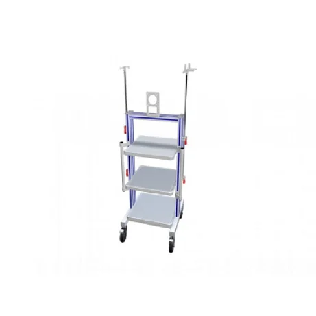 Фармация УМТ3-34 (держатель гибк. эндоскопов и монитора, штатив) – эндоскопическая стойка, предназначенная для установки оборудования. Она создана специально для оснащения пульмонологий, кардиологий, физиотерапевтических кабинетов и так далее. Для производства каркаса использовался конструкционный алюминий. Полки выполнены из оцинкованной стали с покрытием из порошковой краски. В конструкции присутствуют боковые рукоятки, защитные угловые бамперы. В качестве дополнительного оснащения присутствует держатель для 2 гибких эндоскопов, фиксированный кронштейн для монитора (установлен на поперечной балке), инфузионный штатив, расположенный сбоку (оснащен двумя крючками для подвешивания баллонов с лекарствами). Опоры выполнены в виде роликов, два из них оснащены стопорами.