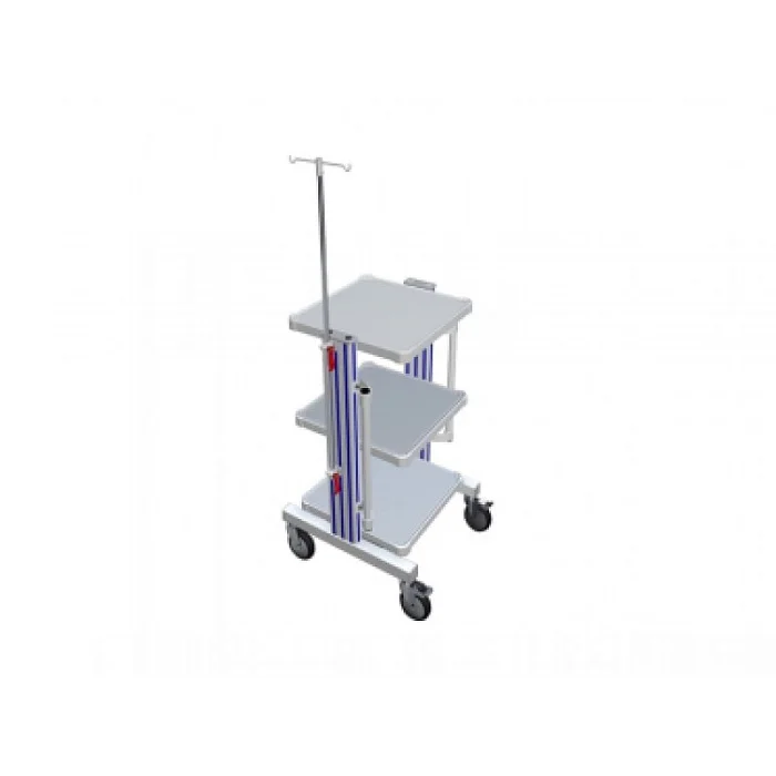 Фармация УМТ3-24 (штатив) представляет собой приборную медицинскую стойку. Модель предназначена для установки медоборудования. Конструкция отлично подходит для оснащения кардиологий, физиотерапических кабинетов, пульмонологий и так далее. Для производства каркаса используется конструкционный алюминий повышенной жесткости. Для установки приборов предусмотрено 3 полки из оцинкованной стали с порошковым покрытием. В конструкции присутствует две рукоятки, а также противоударные бамперы на углах полок. Стойка оснащена двумя крючками для подвешивания баллонов лекарственными препаратами. Передвижная стойка использует в качестве опор ролики, два из них оснащены стопорными механизмами.
