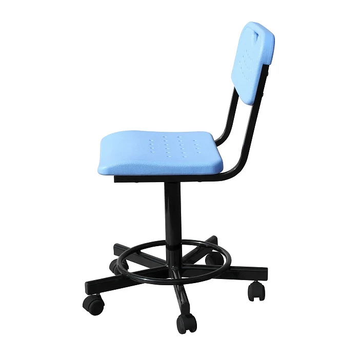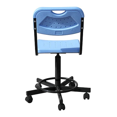 Сиденье и спинка выполнены из утолщённого антивандального пластика. Для медицинских и лабораторных помещений это важно по двум причинам: поверхность быстро очищается и не боится регулярной санитарной обработки, а отсутствие швов и стыков исключает «ловушки» для загрязнений.