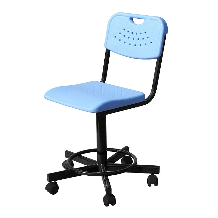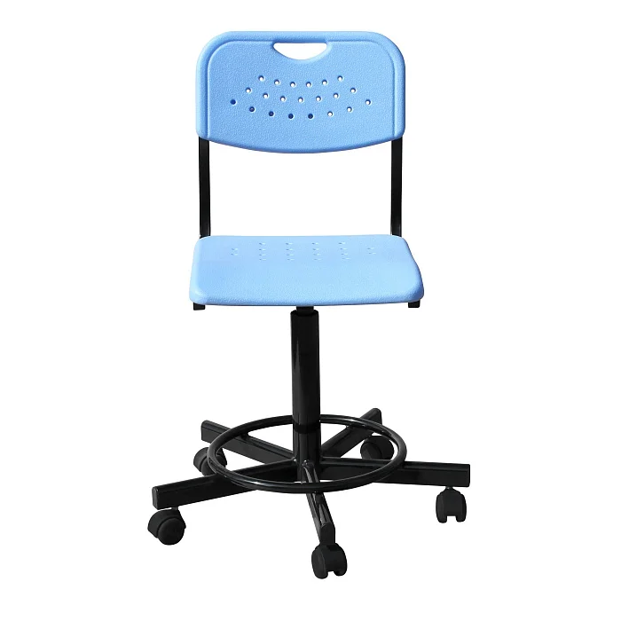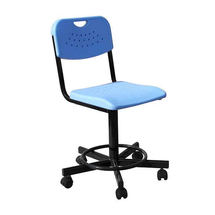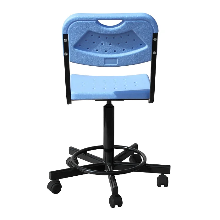 Сиденье и спинка из утолщённого антивандального пластика, вентилируемая конструкция, надёжная 5-лучевая винтовая опора, кольцо-опора для ног, стальной металлокаркас, колёсные опоры для удобства перемещения, регулировка высоты сидения в диапазоне от 450 до 570 мм.