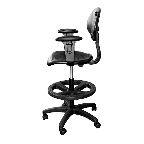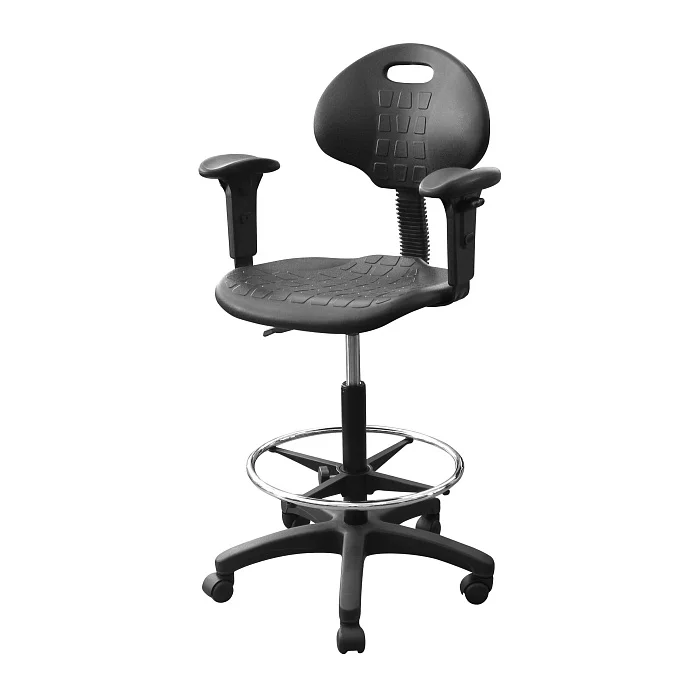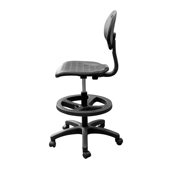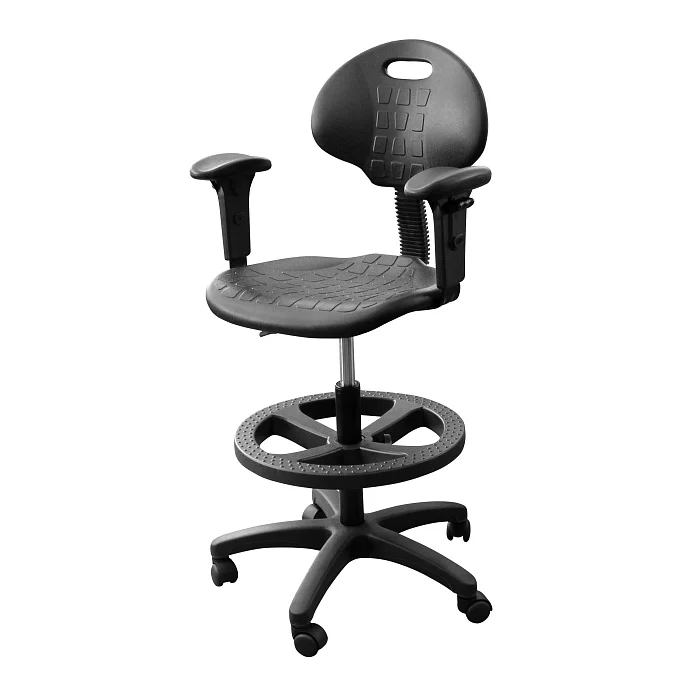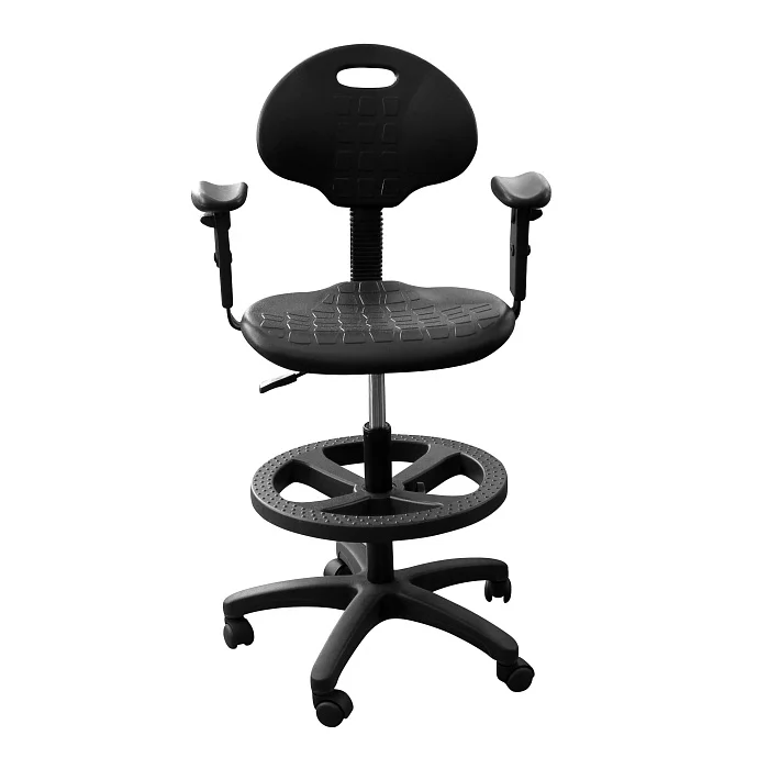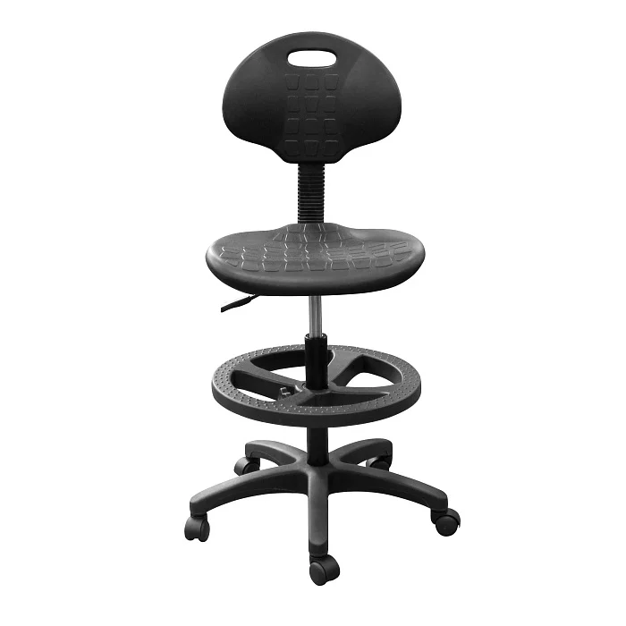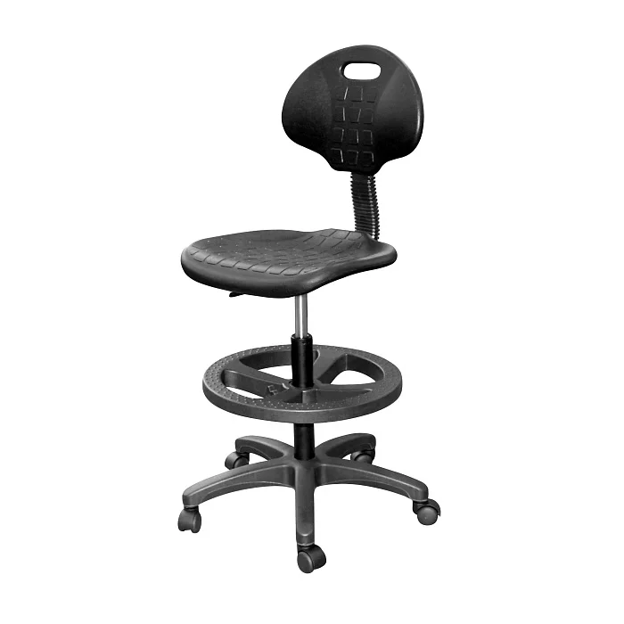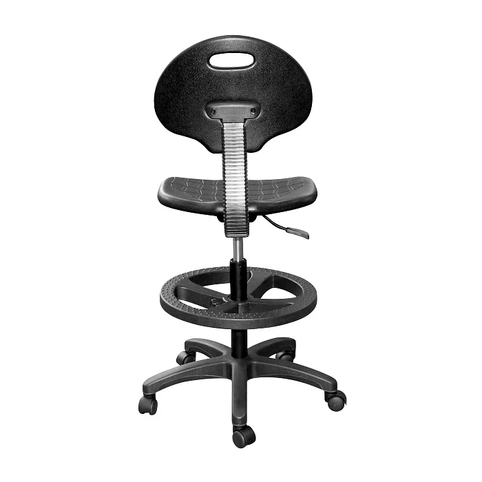 Сиденье и спинка выполнены из полиуретана — материала, который ценят в лабораторной и медицинской среде за предсказуемость в эксплуатации. В отличие от фанеры и обычного пластика, полиуретан упругий и заметно комфортнее при длительной работе. При этом он не требует «бережного режима»: поверхность легко очищается, переносит регулярную обработку и не боится типичных для лабораторий воздействий.