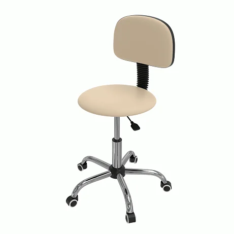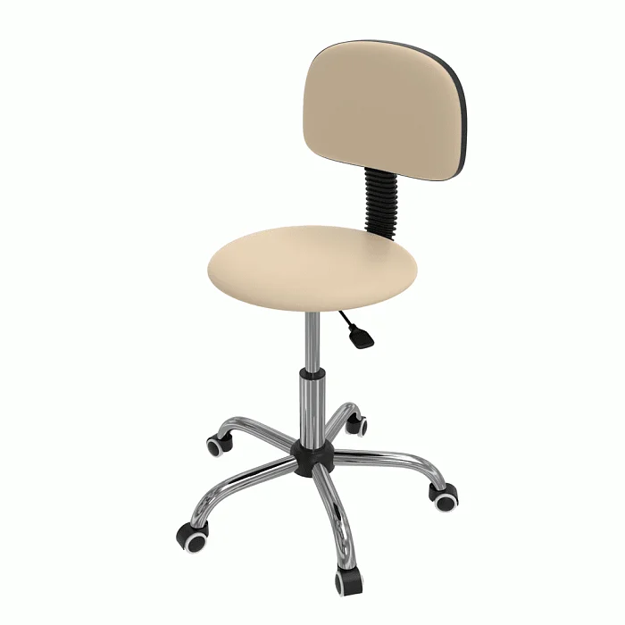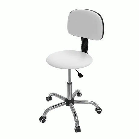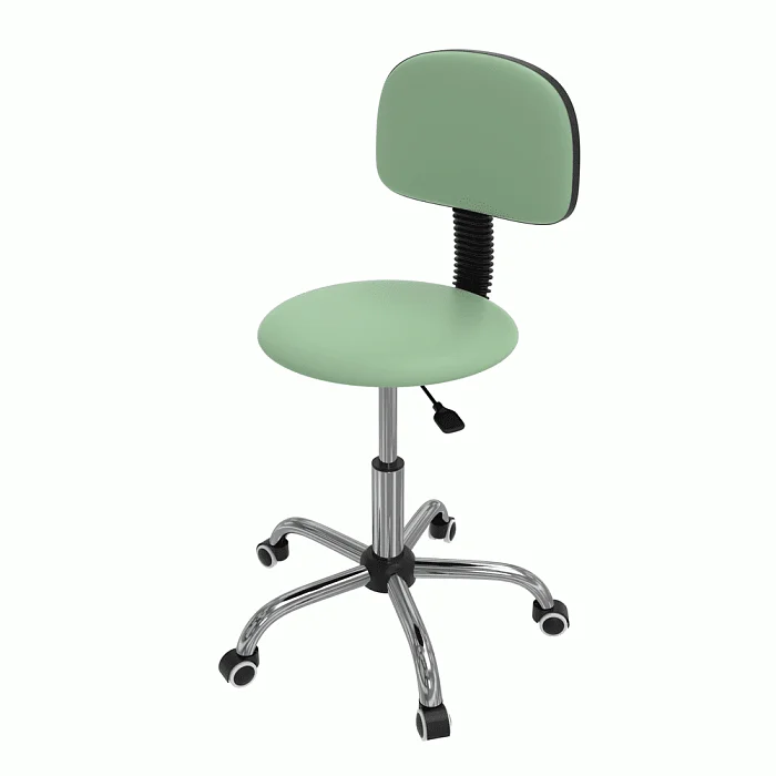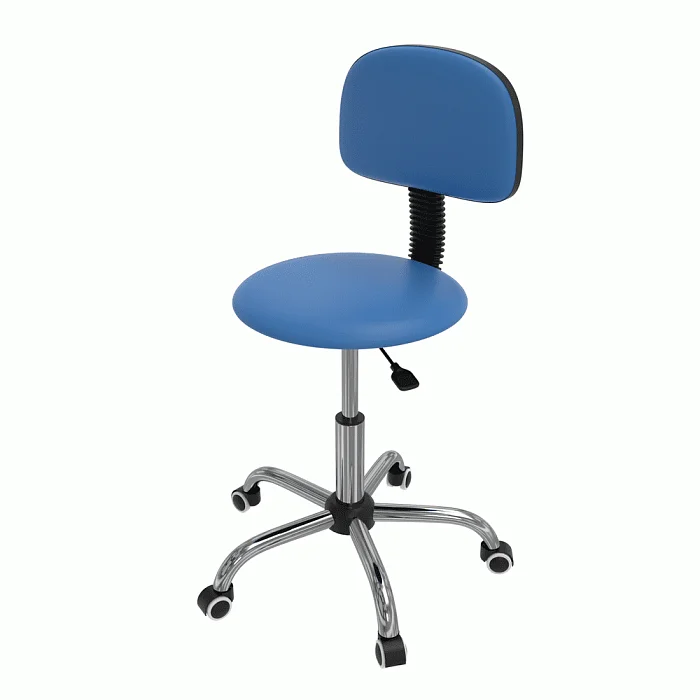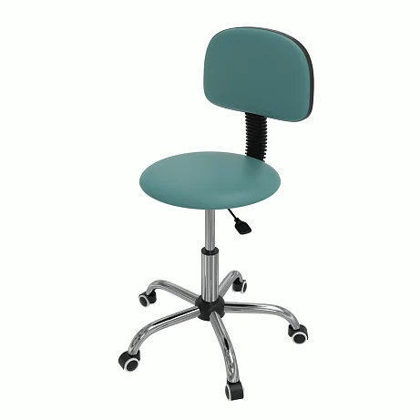 Стул врача изготовлен из стальных труб с защитным гальваническим покрытием круглого сечения. Пятилучевое основание стула установлено на поворотные прорезиненные колесные опоры серого цвета.