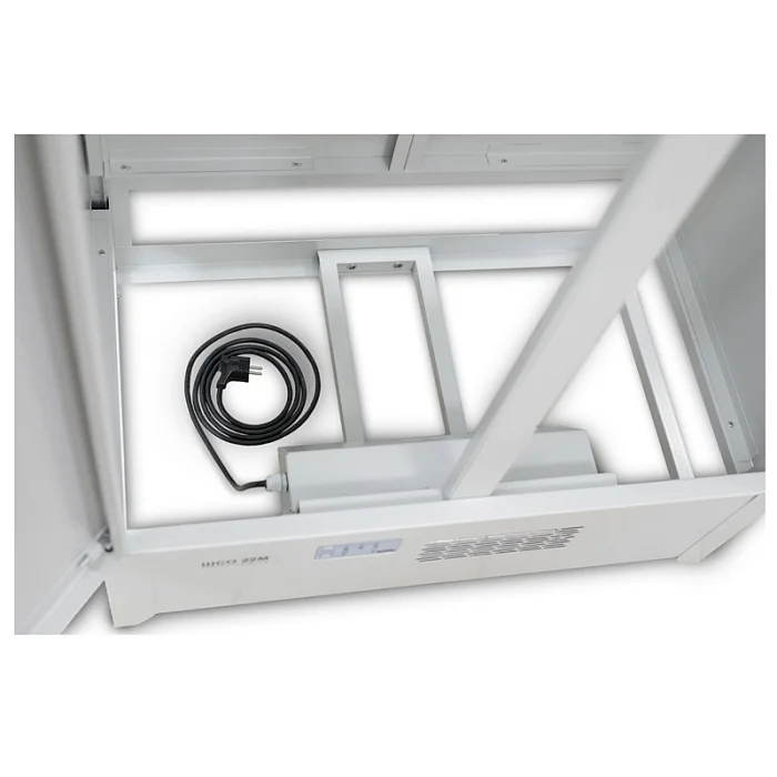 Шкаф подключается к сети 230 В / 50 Гц, длина шнура электропитания составляет 2,5 м от места подсоединения к плате управления. Заземление выполнено через заземляющую жилу и контакт в вилке, что соответствует требованиям безопасной эксплуатации. В комплекте предусмотрены четыре регулируемые ножки, которые помогают выставить шкаф по уровню и адаптировать его к особенностям пола.