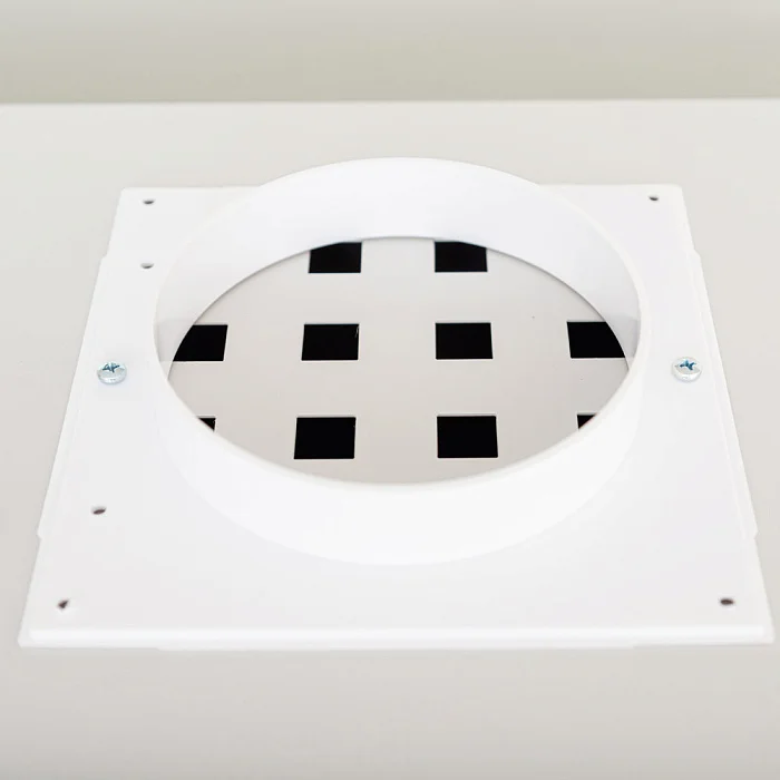 В крышке шкафа предусмотрено отверстие для выхода воздуха, а в комплект входит фланец для подключения к внешней системе вентиляции. Диаметр фланца составляет 120 или 125 мм, что удобно при согласовании с существующей вытяжной системой. Это важная деталь для помещений, где необходимо организовать правильный отвод воздуха и поддерживать комфортный микроклимат.