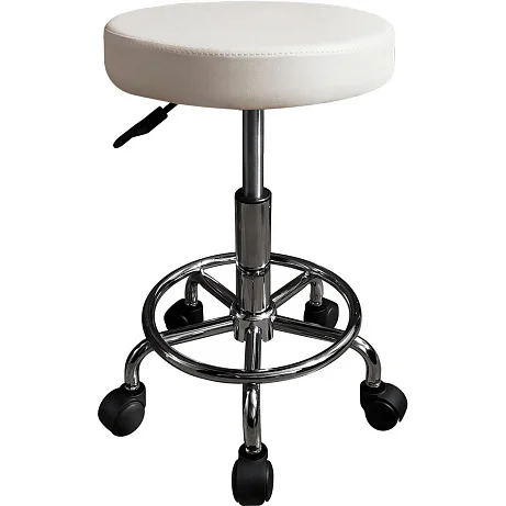 Табурет оснащен системой газлифт, которая позволяет легко менять высоту сиденья, а также он комплектуется роликами или в стационарном варианте подпяточниками. Для ног предусмотрена подставка опора-кольцо. Каркас стальной покрытый порошкой краской хром силвер с эффектом блеска. Табурет поставляется в разобранном виде и упакован в картонную коробку, которая имеет минимальный объем и небольшой вес.